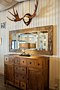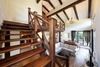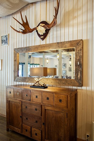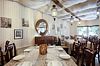 - потолок с массивными деревянными балками венчает шикарная кованная люстра;