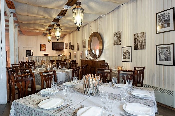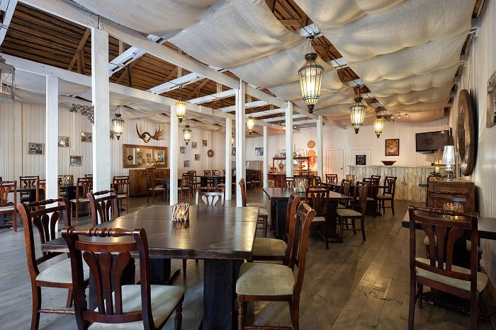 Ресторан комплекса это: уютный зал в стиле Прованс, площадью 140м² вместимостью до 60–70 человек, и летней террасой площадью 260 м² вместимостью до 100 человек, с панорамным видом на озеро, оформленный в стилистике шале. Он идеально подходит для проведения торжественных и корпоративных мероприятий.