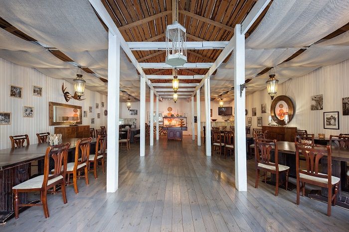 Тем, кто в путешествиях предпочитает исключительно отдыхать и не хочет готовить сам, комплекс может предложить трехразовое питание, включающее в себя завтрак, обед и ужин в ресторане на территории. Также возможна сервировка стола в коттедже. Заказать питание необходимо минимум за 10 дней до заезда.
