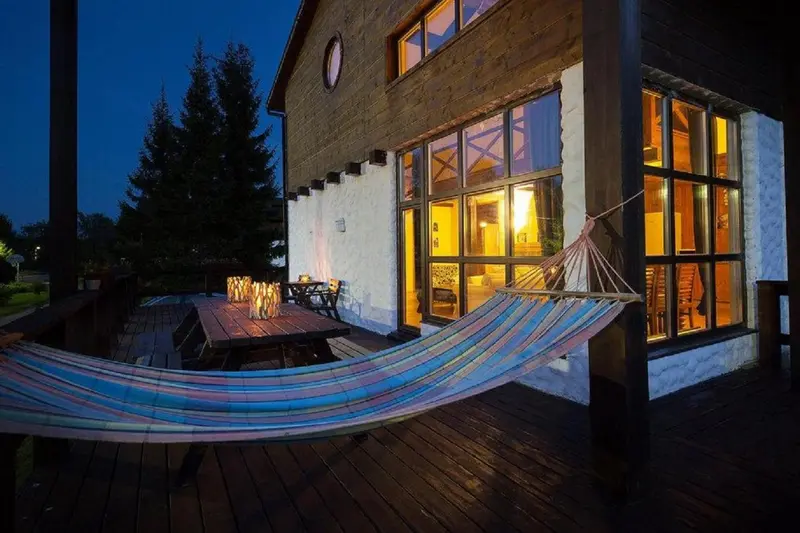 Короткий отпуск с друзьямиСупер место для отдыха большой компанией.Супер место для отдыха большой компанией(8 человек в коттедже) при этом ценник "не задран до небес"! Рядом чистое озеро, заход песочный. Мы бронировали 5 коттеджей, супер вариант для корпоратива. Персонал ненавязчивый, территория большая, ухоженные газоны, можно в теннис поиграть, хорошая мангальная зона у каждого коттеджа, а также есть общая зона для мангала. Прекрасные террасы с навесом, мы весь вечер провели там, коттедж шикарен, продумано все для комфортного отдыха, есть посудомойка, стир.машина, микроволновка, холодильник, супер гостиная, если плохая погода , никому тесно не будет, очень удобные кровати, матрасы