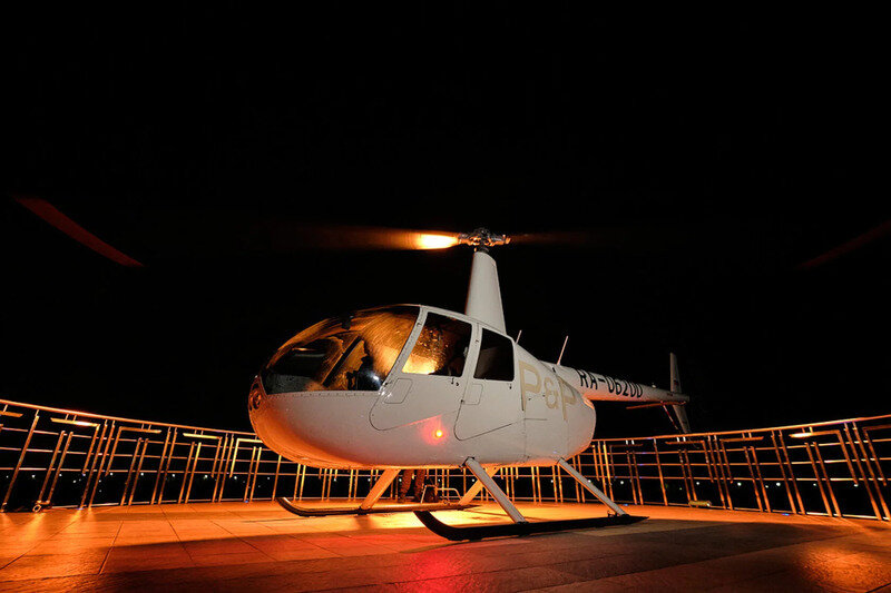 Вертолетная площадка с ночной сигнальной системой принимает борты класса Еврокоптер. Далее на лифте можно сразу попасть за стол или в баню.