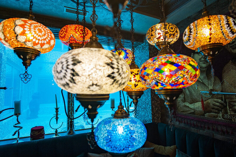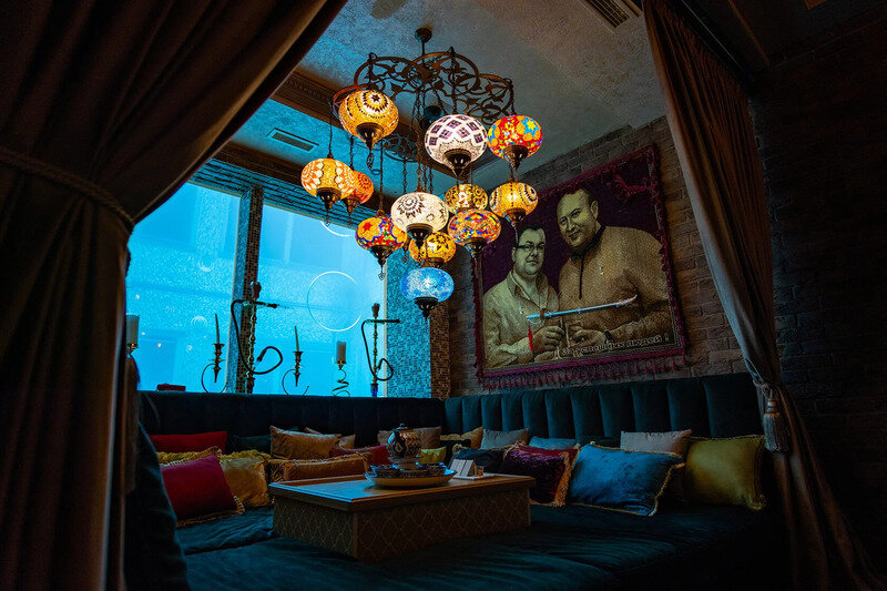 Турецкий лаундж оформлен мягкими диванами, подушками и приглушенным освещением, что способствует комфортному отдыху и разговорам.