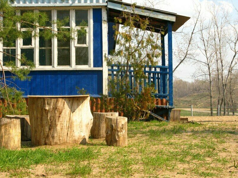 Деревянный дом состоит из 2 комнат, в одной могут разместиться 2 человека, в другой до 3. На веранде: стол, стулья, холодильник. В комнате: кровать двухспальная, стол, сплит-система.