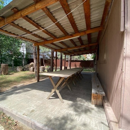 Дом имеет большую беседку с мангалом, рядом сцена и огромная поляна, где можно играть в различные активные игры, в том числе натянута волейбольная сетка.