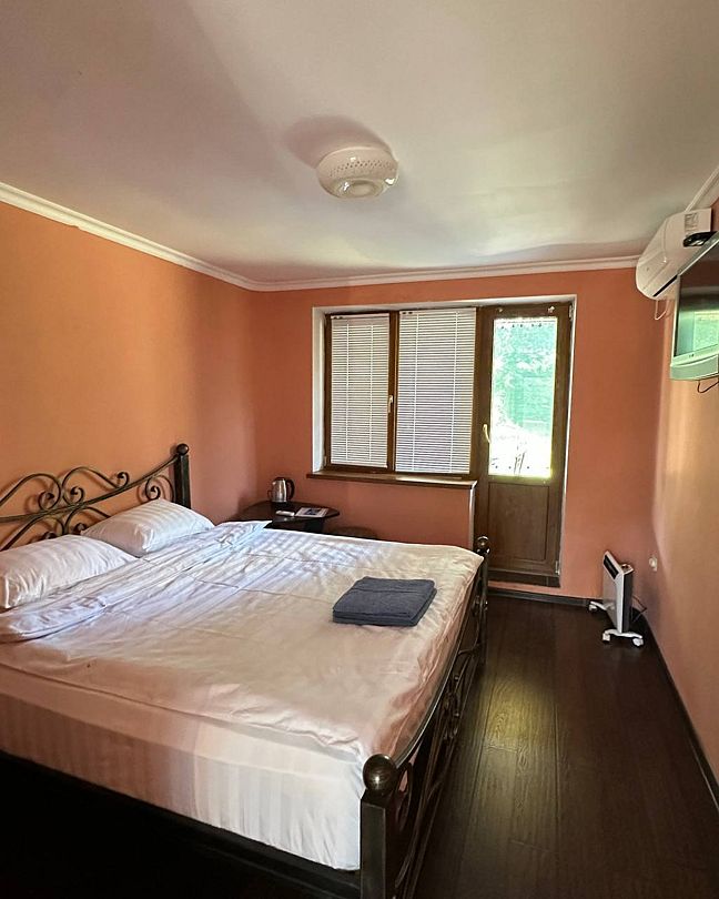 Располагает просторной спальной комнатой с двуспальной кроватью, а также тумбой, телевизором, холодильником, сплит-системой, чайником, микроволновой печью. В ванной комнате: душевая кабина, раковина, санузел, туалетные принадлежности.