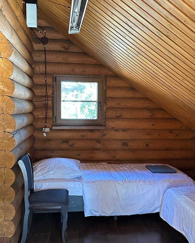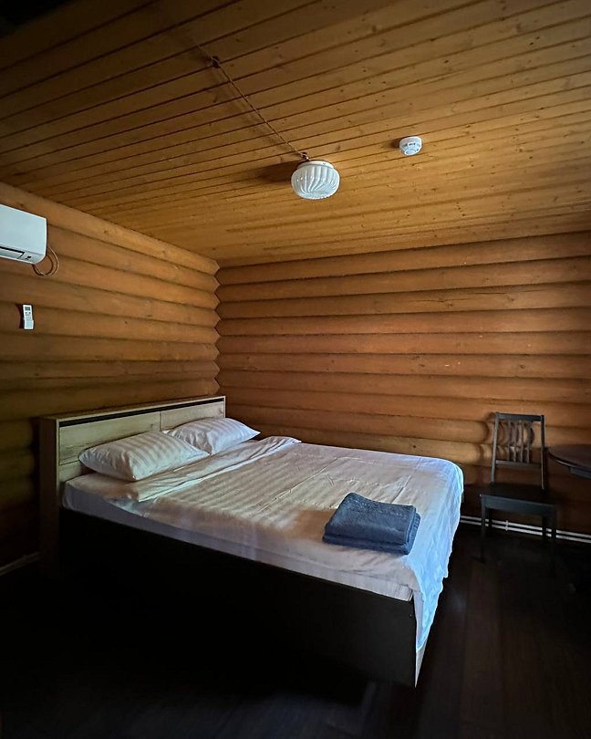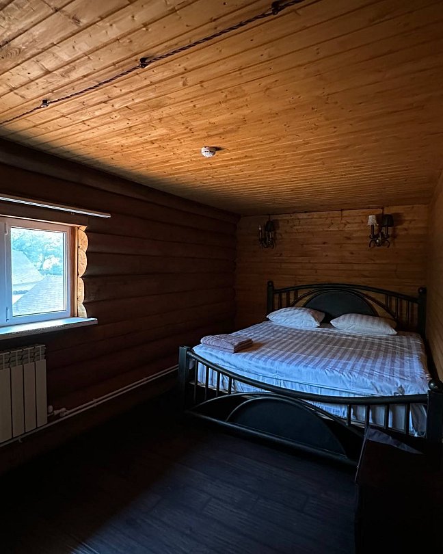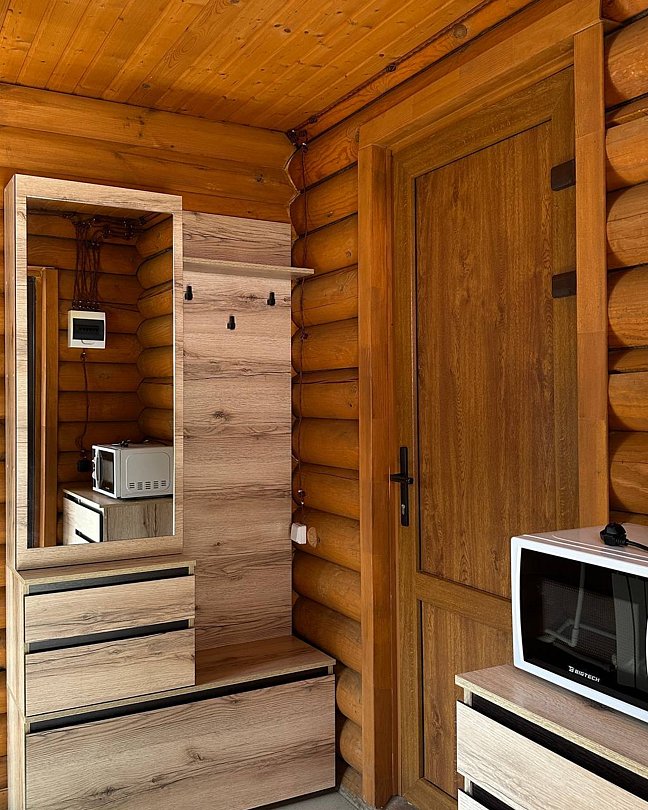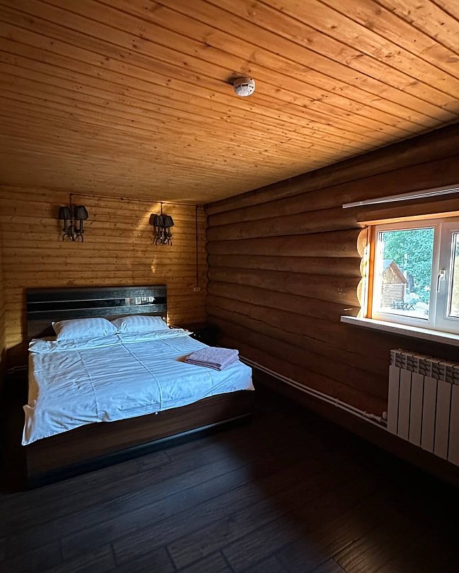 Двухэтажный благоустроенный коттедж (сруб), рассчитанный на шестерых гостей. На втором этаже две большие спальни с двуспальными кроватями, а на первом этаже расположены кухонный гарнитур, обеденная зона с мягким уголком, мебель для отдыха, сплит-система, телевизор, чайник и микроволновая печь.