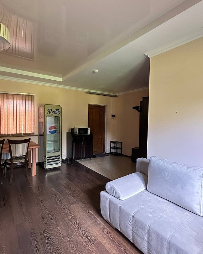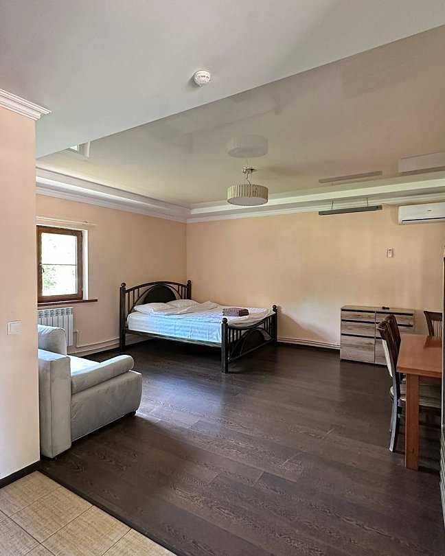 Располагает просторной спальной комнатой с двуспальной кроватью, а также диван, обеденный стол, стулья, шкаф, телевизор, холодильник, чайник, микроволновая печь, сплит-система. В ванной комнате: душевая кабина, раковина, санузел, туалетные принадлежности.
