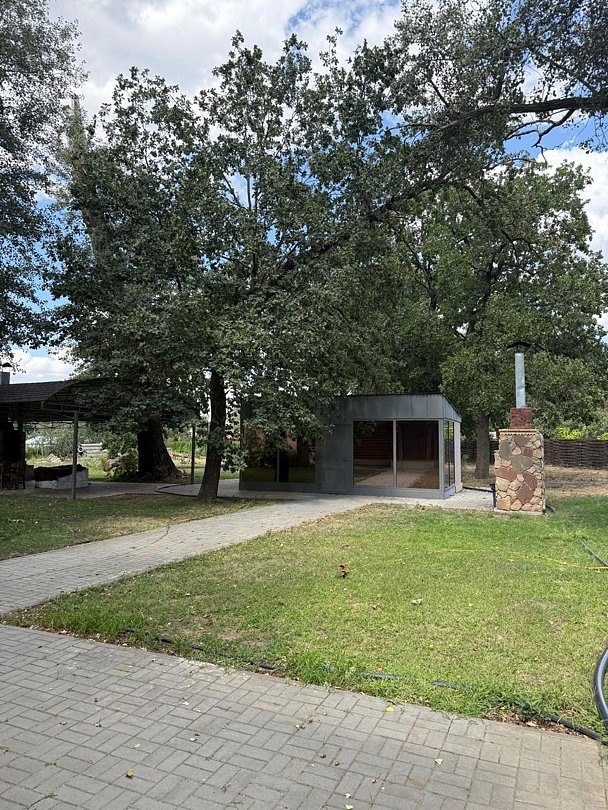 Рядом с домом есть мангальная зона с застекленной беседкой, стол, стулья, холодильник, сплит-система, а также открытая беседка.
