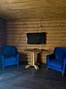 Двухэтажный благоустроенный коттедж, разделенный на две половины, общей вместимостью двенадцать человек. На первом этаже каждой половины находятся зал с мягким диваном, рассчитанным на четыре спальных места, стол, кресла, камин, кондиционер, телевизор, холодильник, чайник и микроволновая печь, а также два санузла, две душевые кабины и две раковины.