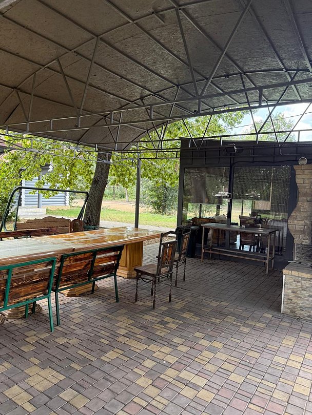 Рядом с домом есть мангальная зона с застекленной беседкой, стол, стулья, холодильник, сплит-система.