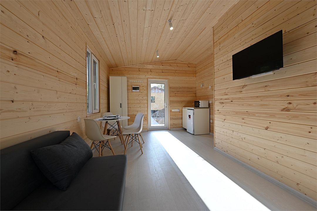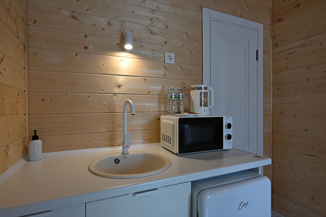 НедостаткиТонкие стены в домике, совместные с другими постояльцами, отсутствие холодильника