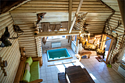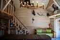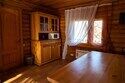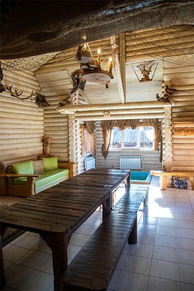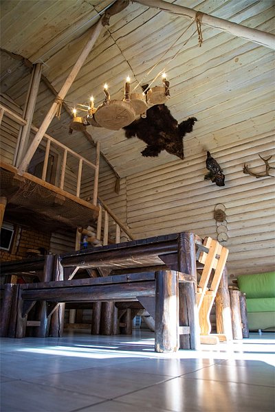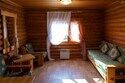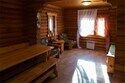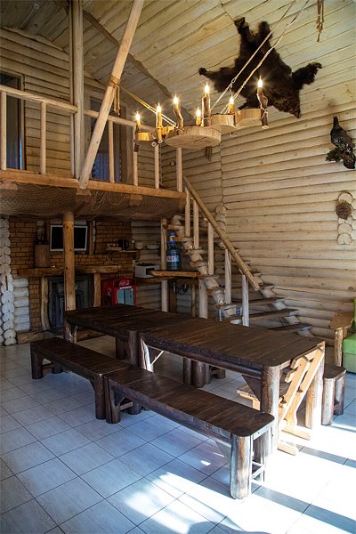 Двухэтажный сруб с камином и баней. На первом этаже просторная гостиная с камином, мягкой мебелью (три дивана, пуфы), кухонным уголком и небольшой купелью, сауна. На втором этаже две спальные комнаты (двуспальные кровати). В коттедже также: ЖК телевизор, (колонка со входом флеш карты по предварительному запросу), холодильник, электрический чайник, микроволновая печь, посуда, санузел, душевая кабина. Крытый двор со столами и лавками, зона мангала.
