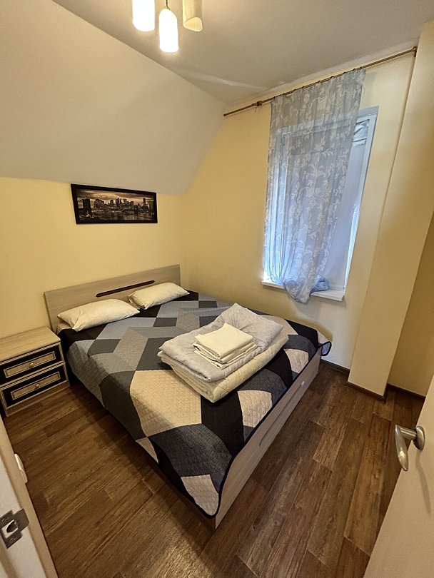 Дом с 3 спальнями, в двух спальнях двуспальные кровати, в одной две полутораспальные. В гостиной большой диван , возможно разместить 2 человека. Кухня оборудована техникой и посудой. Туалет, душ.