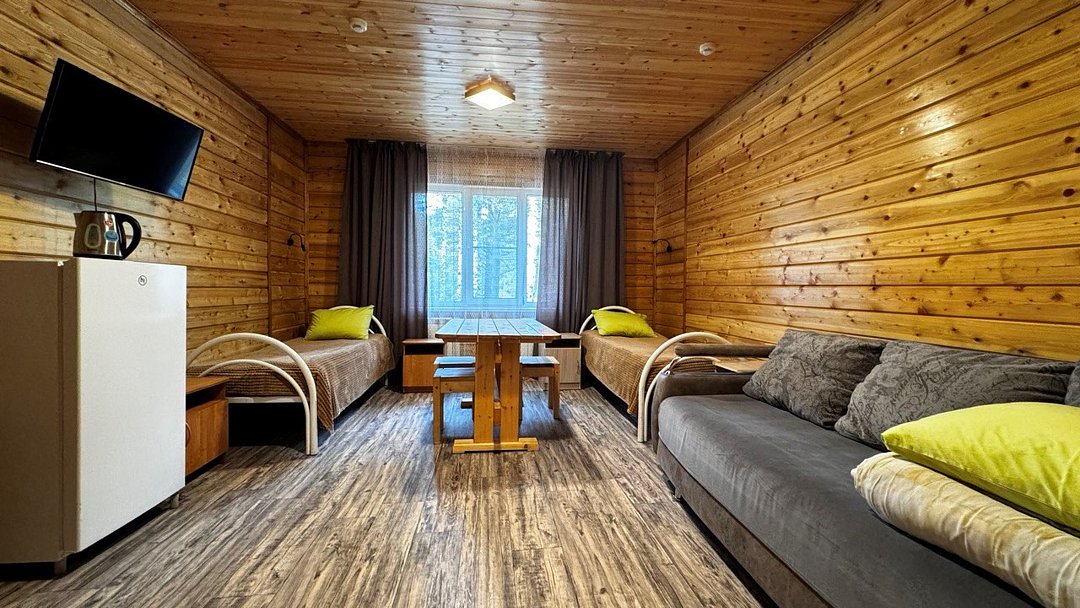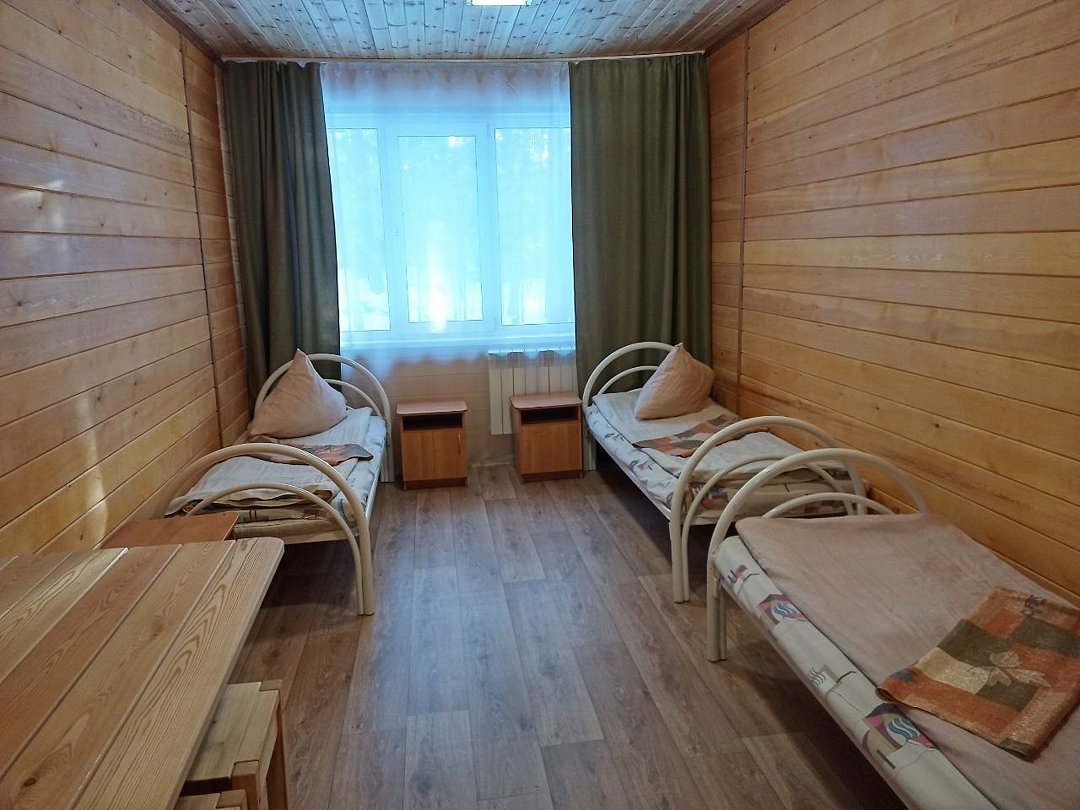 телевизор, Wi-Fi, холодильник, микроволновая печь, вешалки, зеркало, комод, чайник, три односпальные кровати, вид во двор, стул, стол, санузел на этаже, душ на этаже, вид на лесВ номере