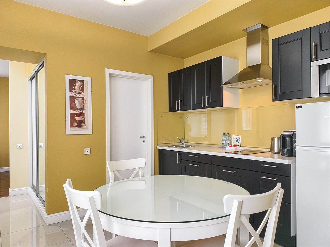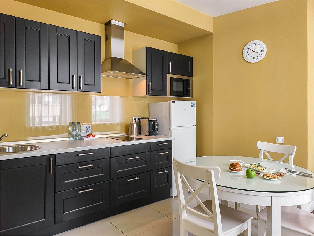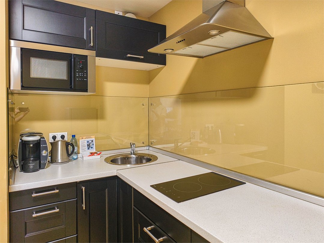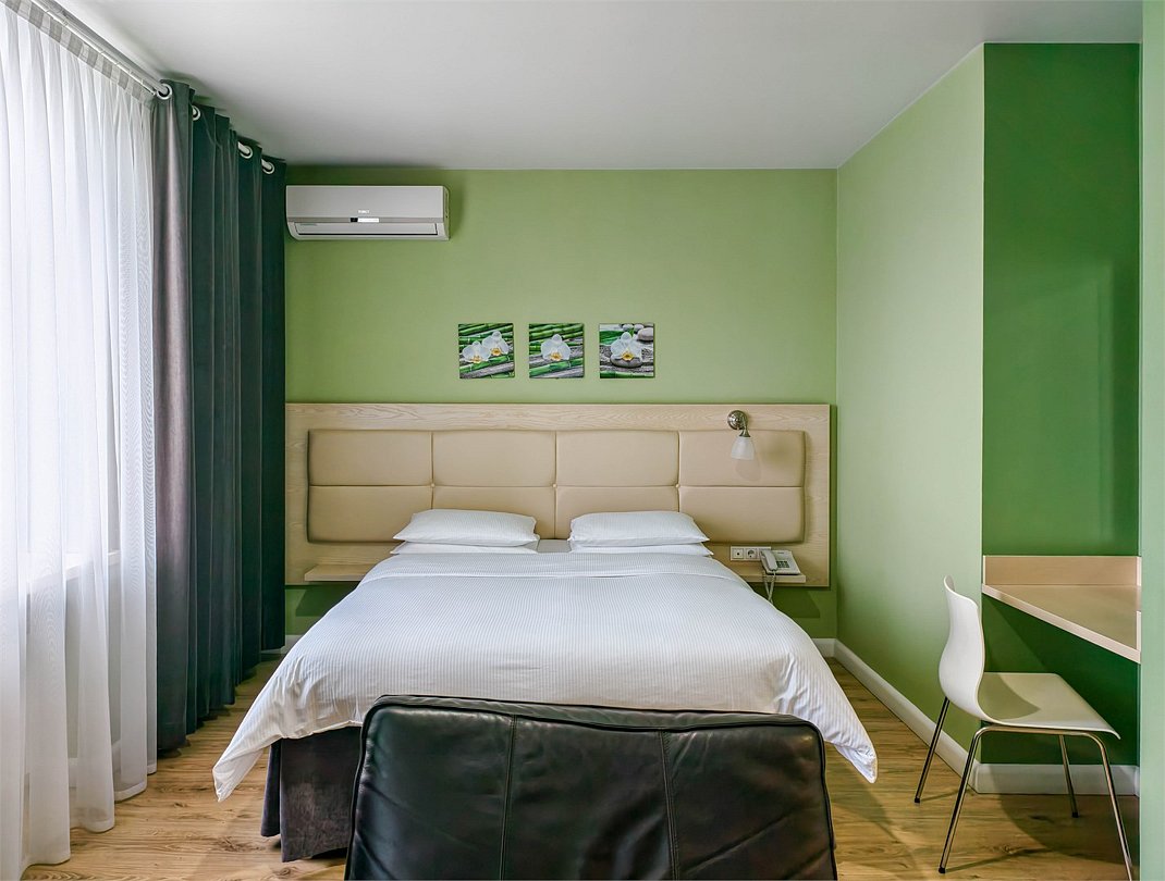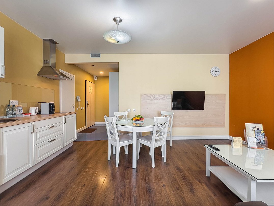 Превосходный номер, полностью оборудованный для длительного проживания. Номер состоит из 2 зон для работы и отдыха, а также полностью укомплектованной кухни. Номер рассчитан на проживание 1-2 человек. Номера представлены в светло-зеленой и персиковой цветовой гамме.Услуги и удобства