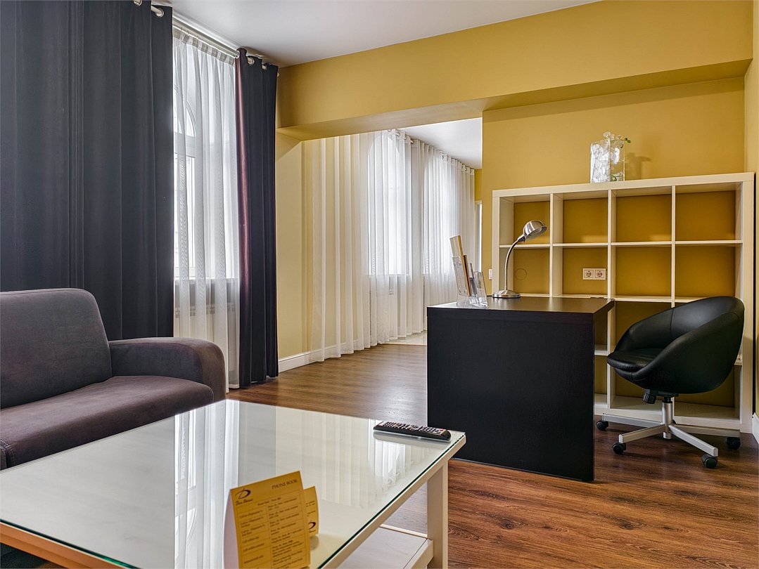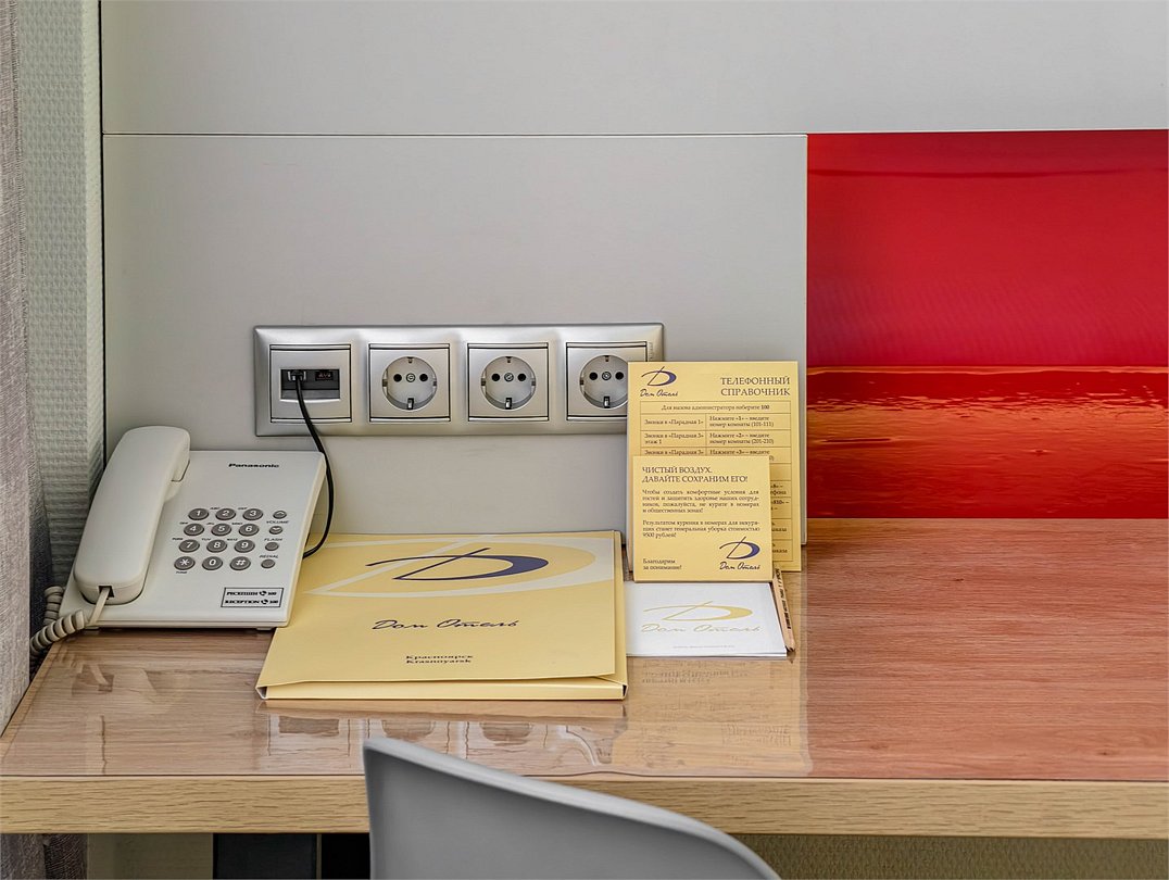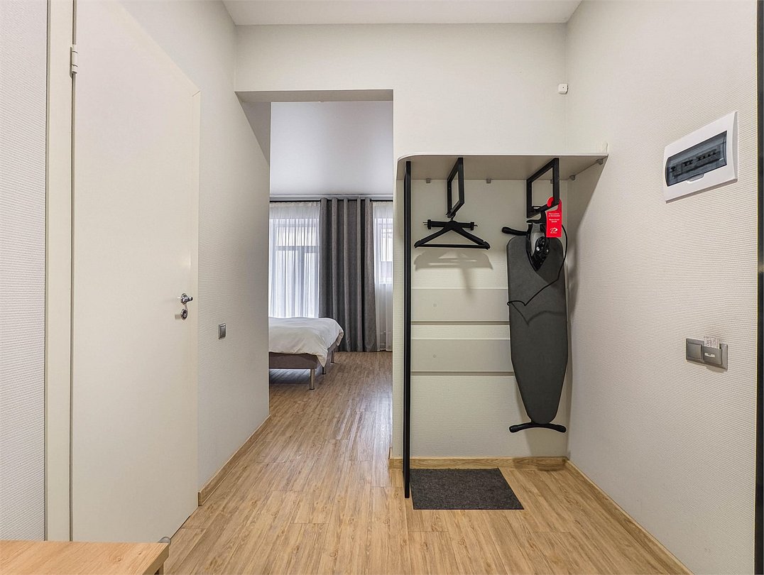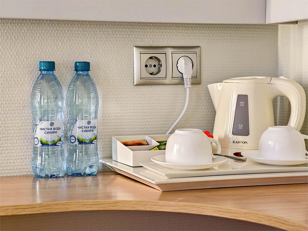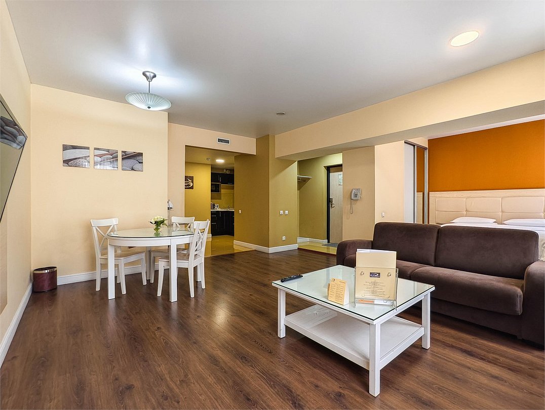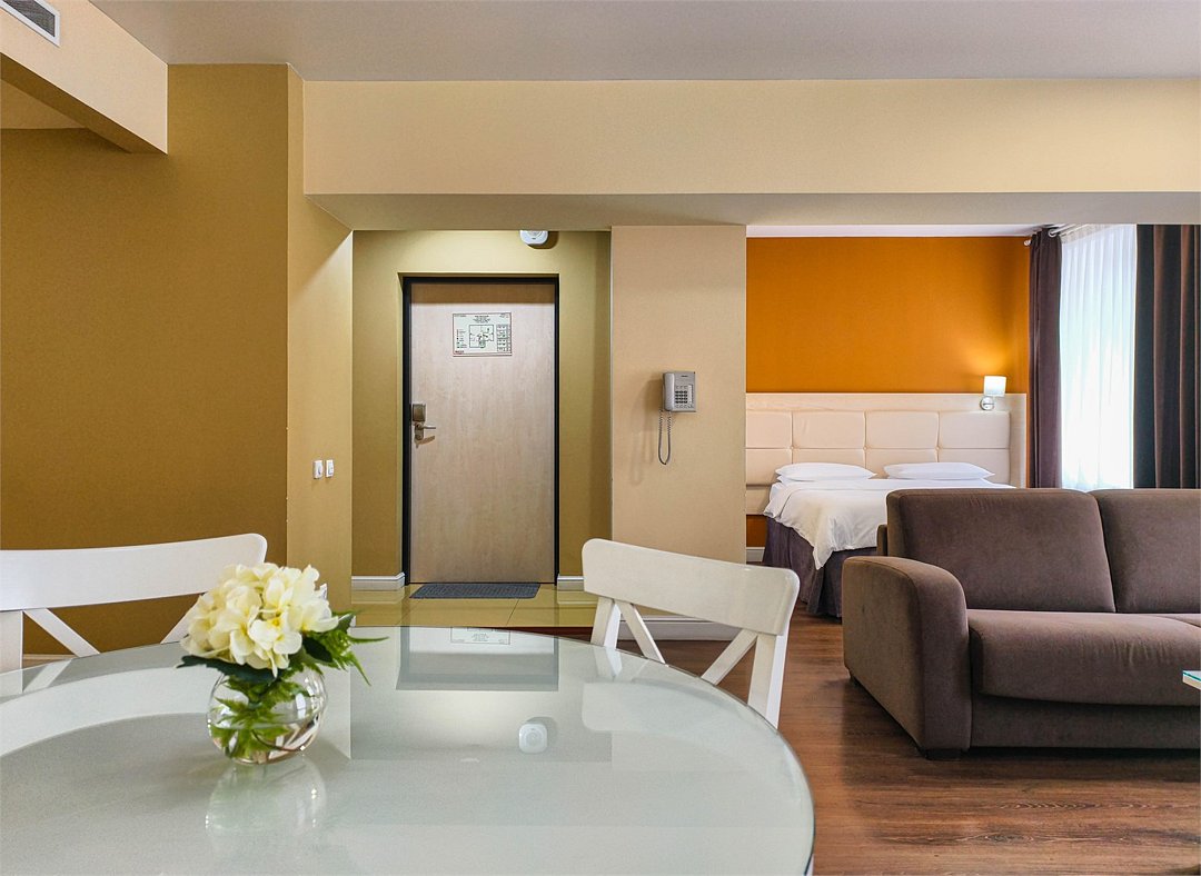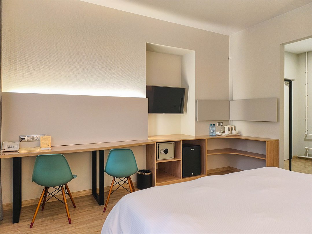 телевизор, кабельное телевидение, интерактивное телевидение, Wi-Fi, телефон, холодильник, фен, система безопасности, электронные замки, плита для приготовления пищи, кофемашина, микроволновая печь, утюг, душевая кабина, гигиенические средства, кровать «Queen size», гладильная доска, ортопедический матрас, диван, стулья, шкаф для одежды, вешалки, журнальный столик, обеденный стол, багажная тумба, зеркало, кухня, чайный набор, набор посуды, информационная карта, меню, сейф, стиральная машина, чайник, унитаз, раковина, мягкая мебель, косметическое зеркало, отопление, душ, вид на город, плиточное покрытие, центральное кондиционирование, вид во двор, паркет, бутилированная водаВ гостиничном номере