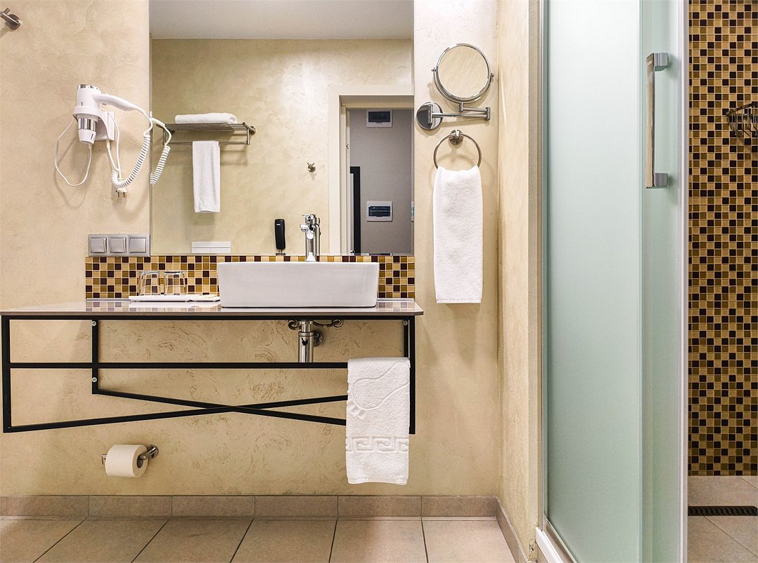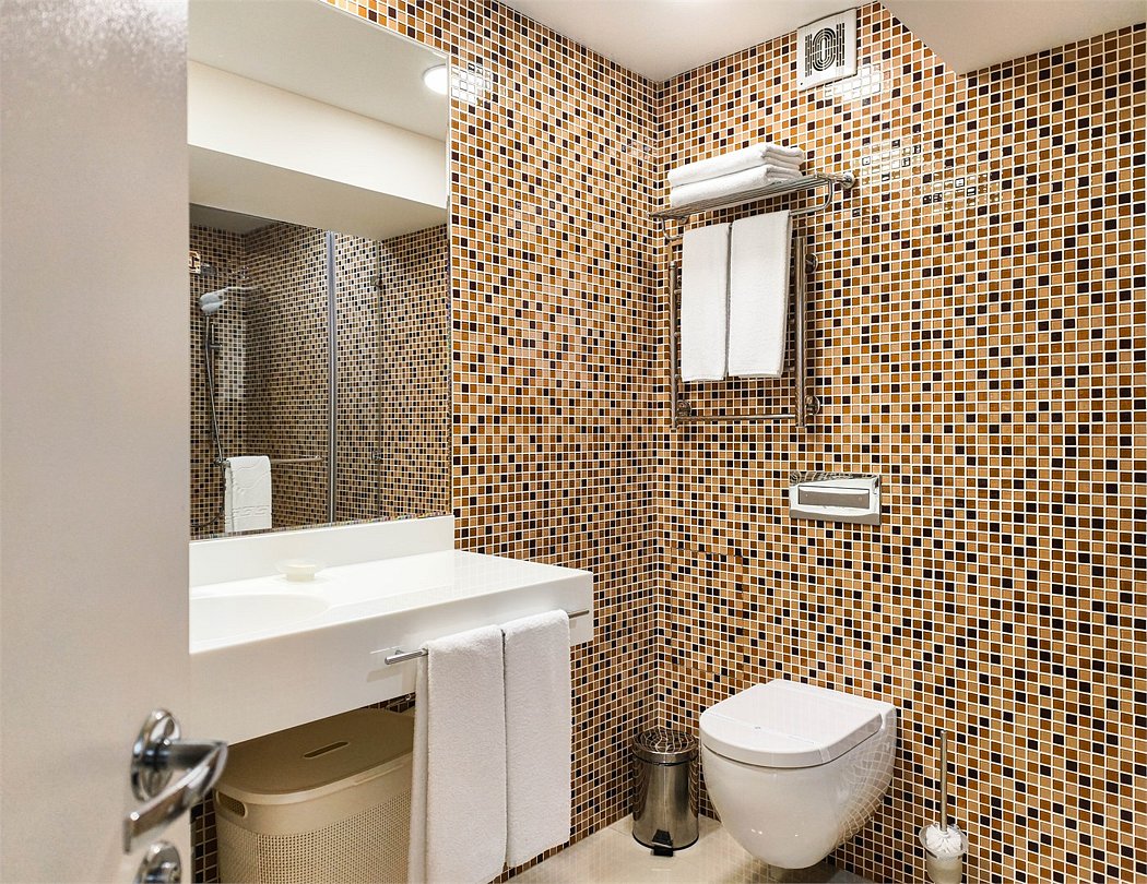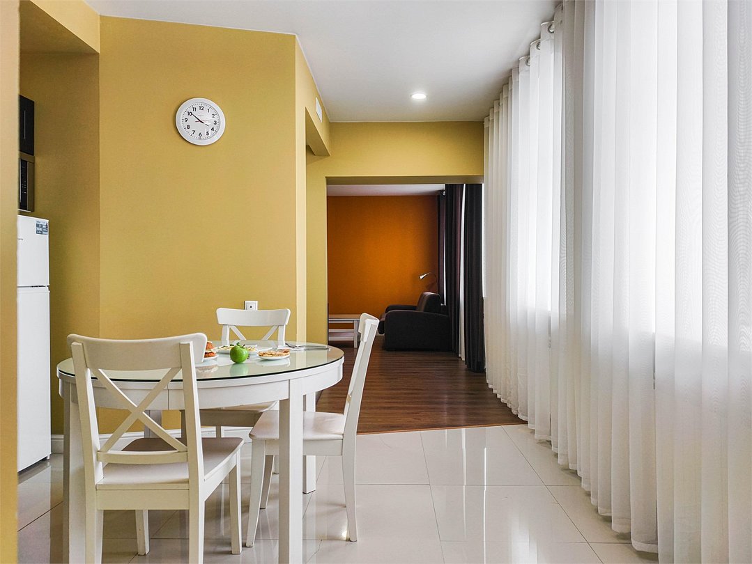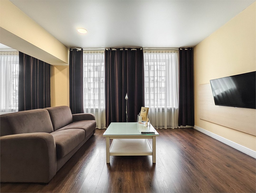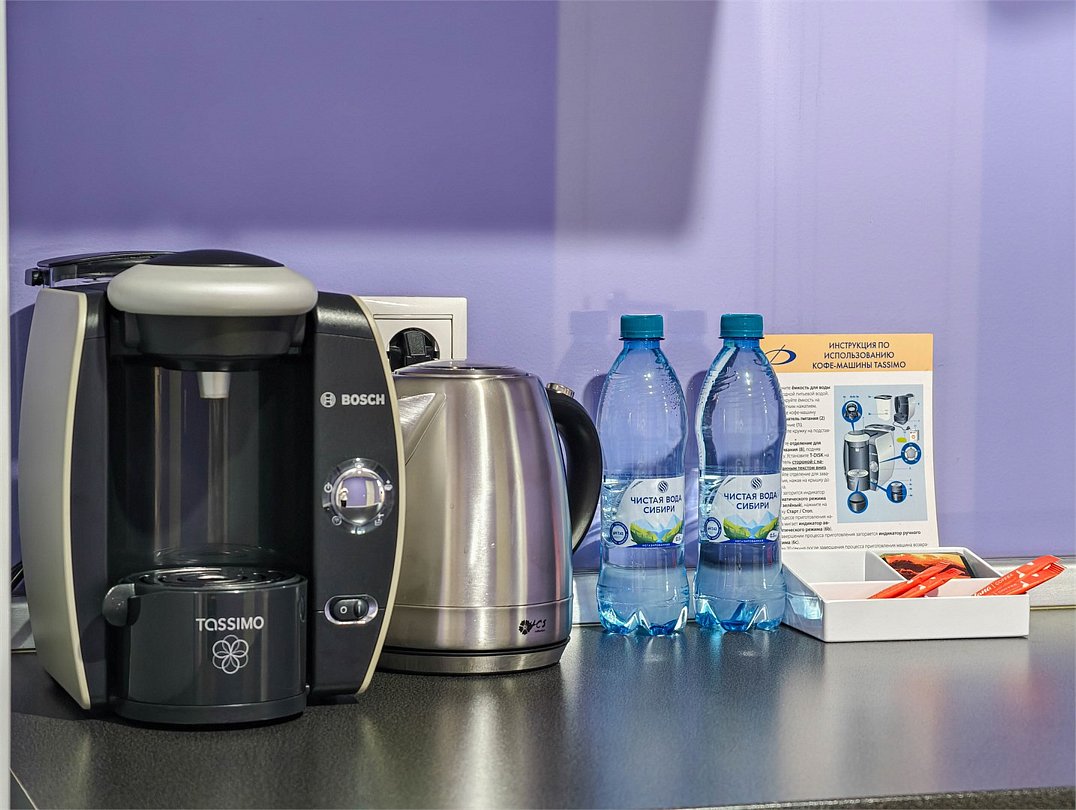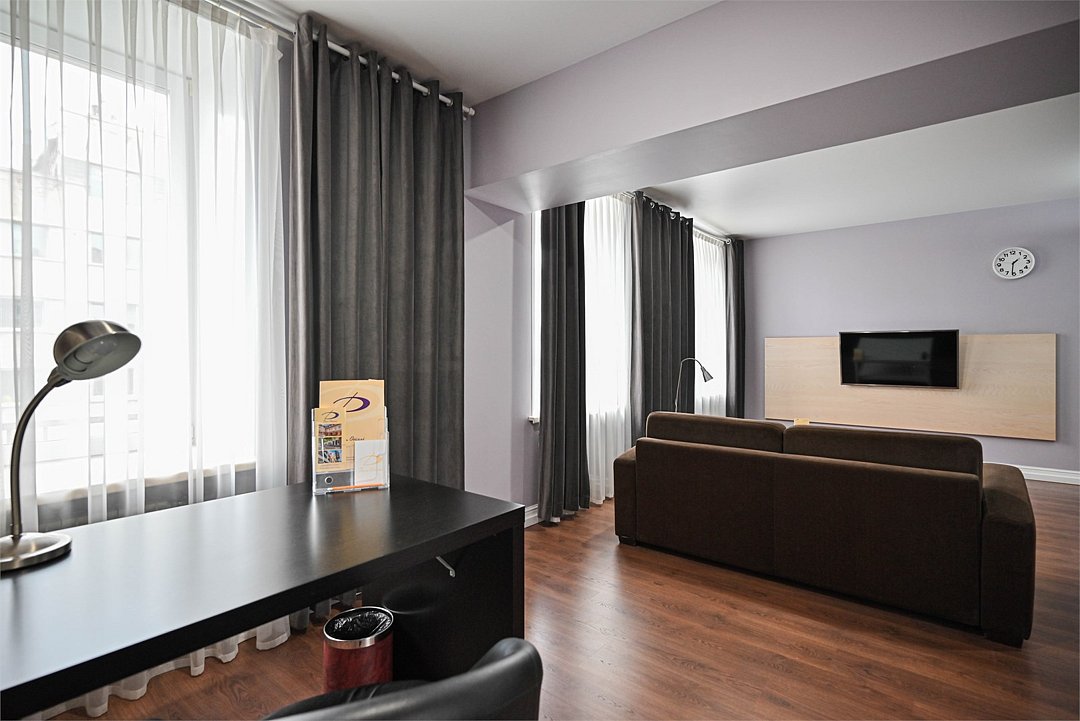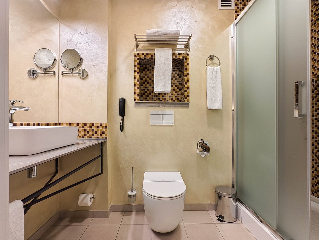 телевизор, кабельное телевидение, интерактивное телевидение, Wi-Fi, телефон, холодильник, фен, система безопасности, электронные замки, плита для приготовления пищи, кофемашина, микроволновая печь, утюг, душевая кабина, гигиенические средства, кровать «Queen size», гладильная доска, ортопедический матрас, диван, стулья, шкаф для одежды, вешалки, журнальный столик, обеденный стол, багажная тумба, зеркало, кухня, чайный набор, набор посуды, информационная карта, меню, сейф, стиральная машина, чайник, унитаз, раковина, мягкая мебель, косметическое зеркало, отопление, душ, вид на город, плиточное покрытие, центральное кондиционирование, вид во двор, паркет, бутилированная водаВ гостиничном номере