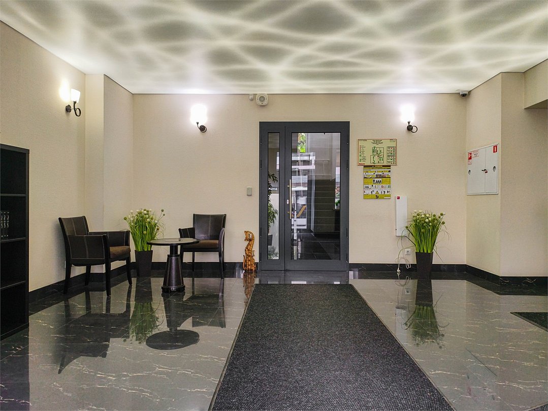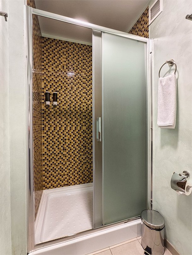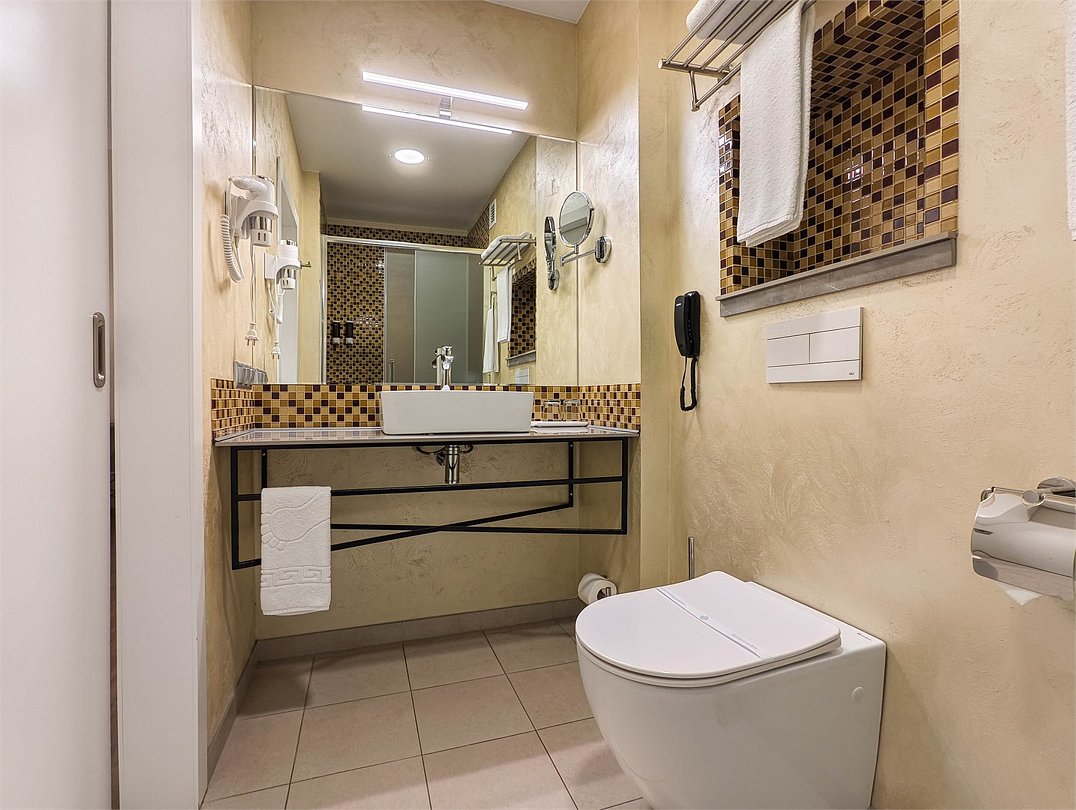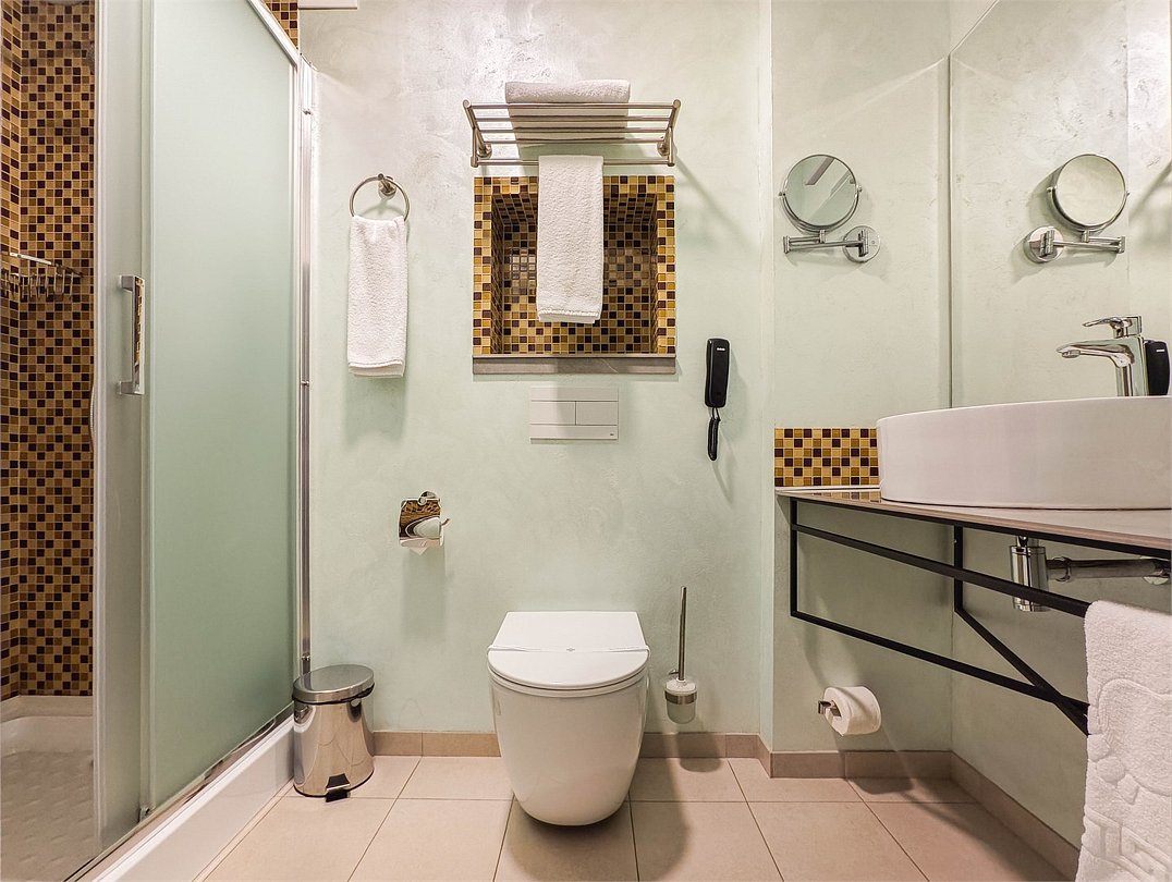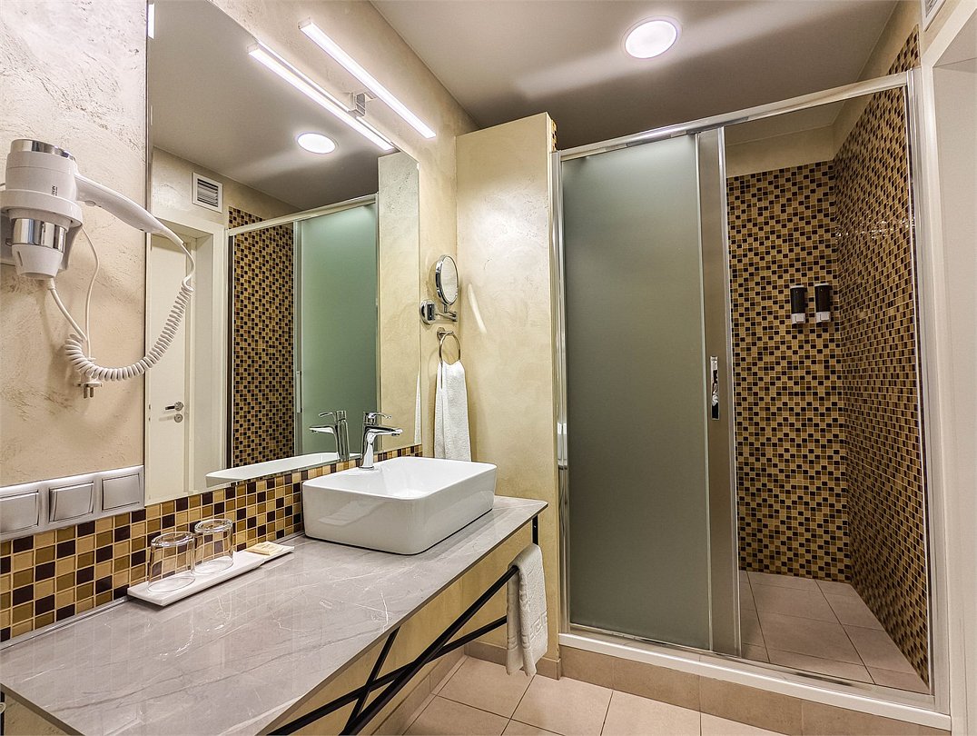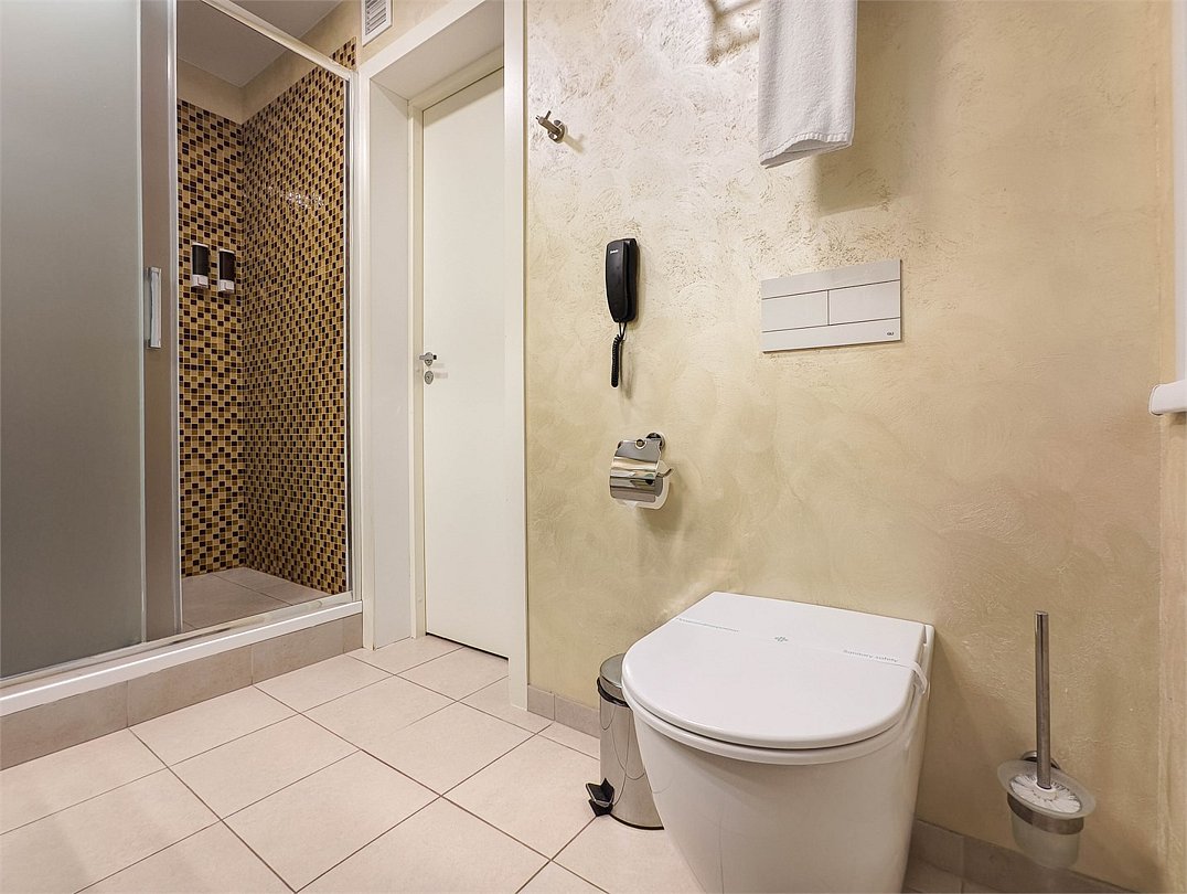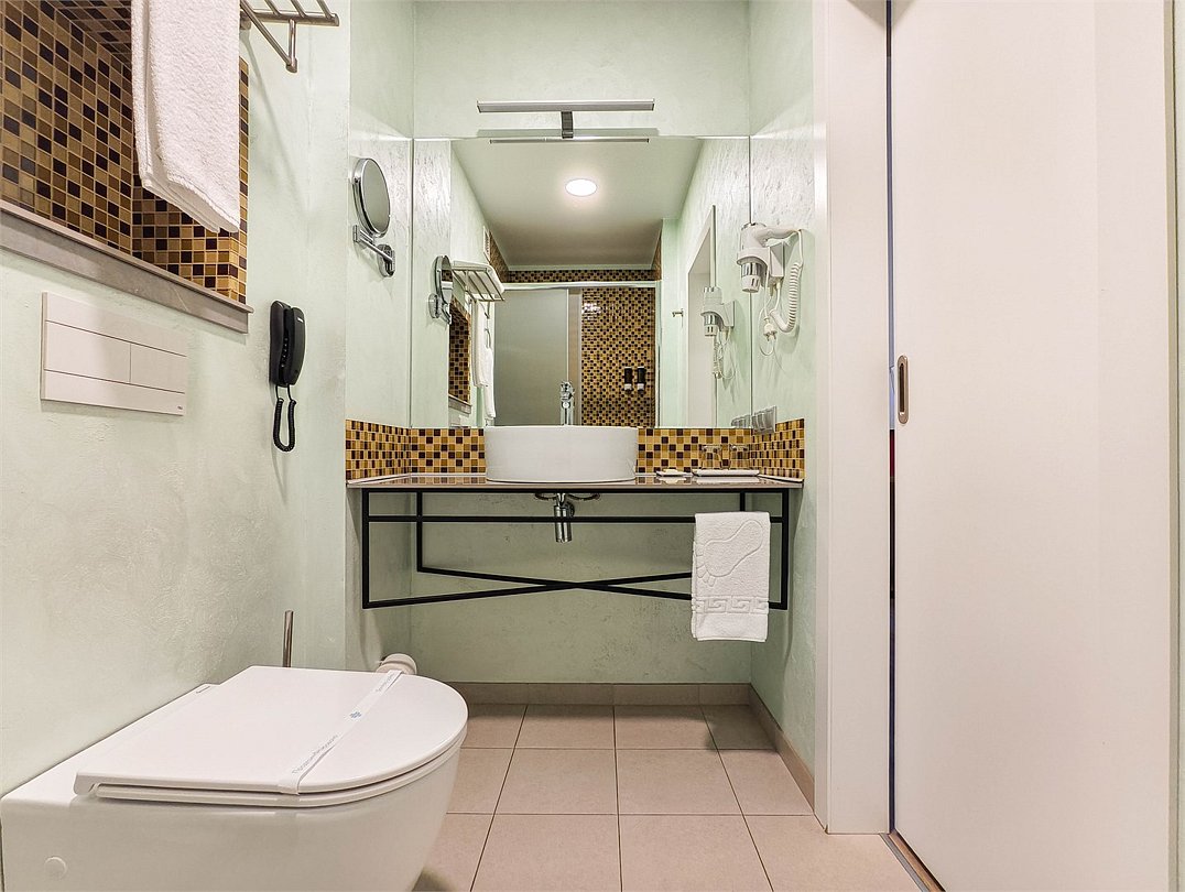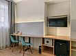 телевизор, кабельное телевидение, интерактивное телевидение, Wi-Fi, телефон, холодильник, фен, система безопасности, электронные замки, плита для приготовления пищи, кофемашина, микроволновая печь, утюг, душевая кабина, гигиенические средства, кровать «Queen size», гладильная доска, ортопедический матрас, диван, стулья, шкаф для одежды, вешалки, журнальный столик, обеденный стол, багажная тумба, зеркало, кухня, чайный набор, набор посуды, информационная карта, меню, сейф, стиральная машина, чайник, унитаз, раковина, мягкая мебель, косметическое зеркало, отопление, душ, вид на город, плиточное покрытие, центральное кондиционирование, вид во двор, паркет, бутилированная водаВ гостиничном номере