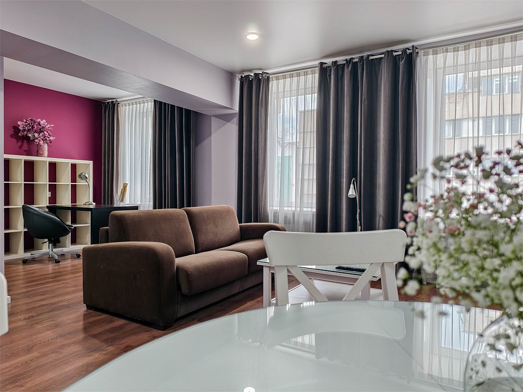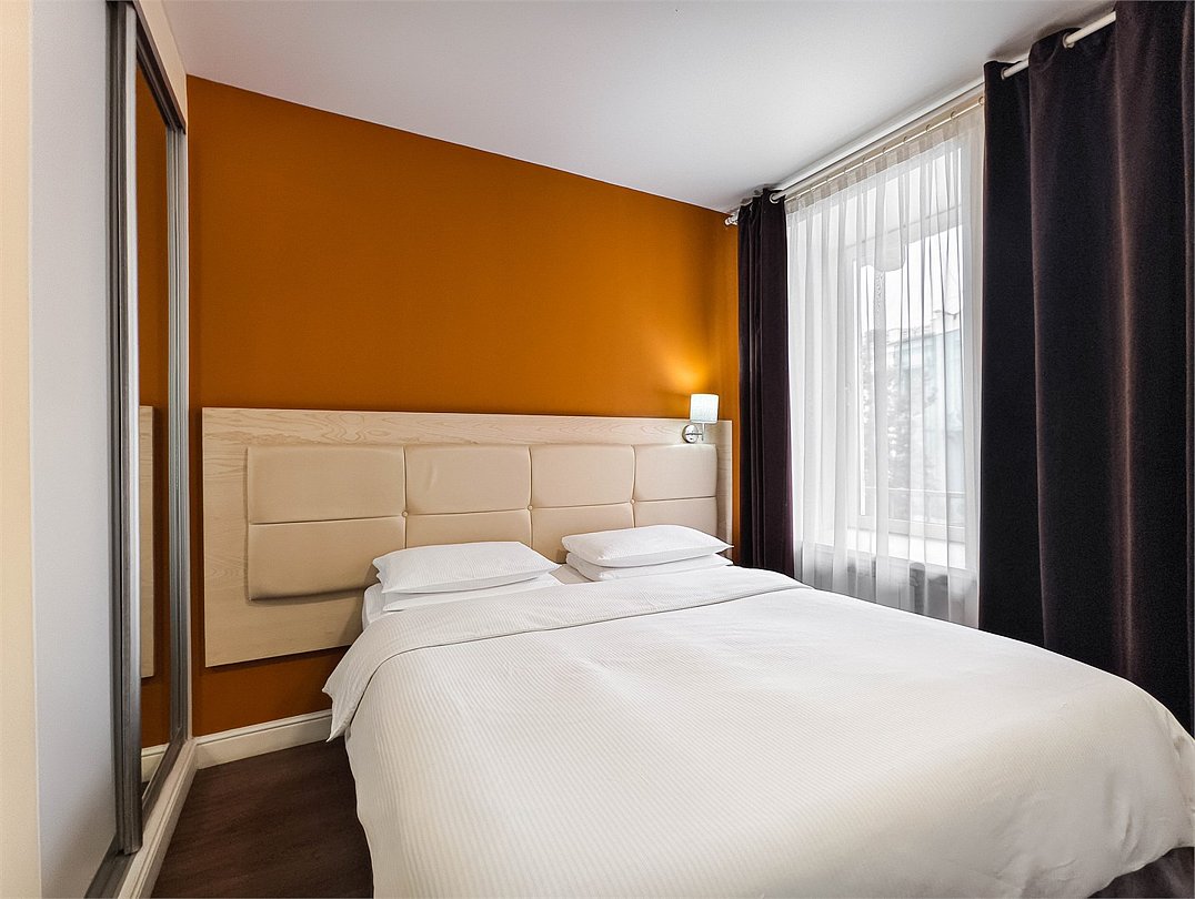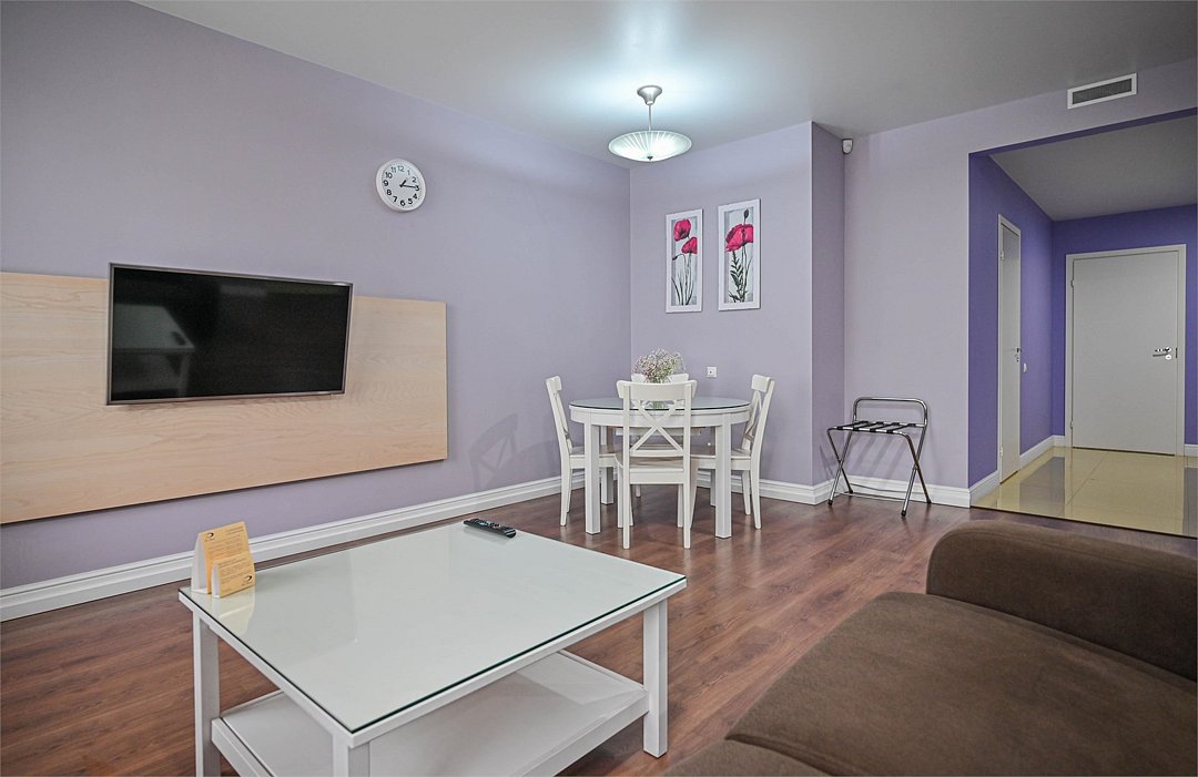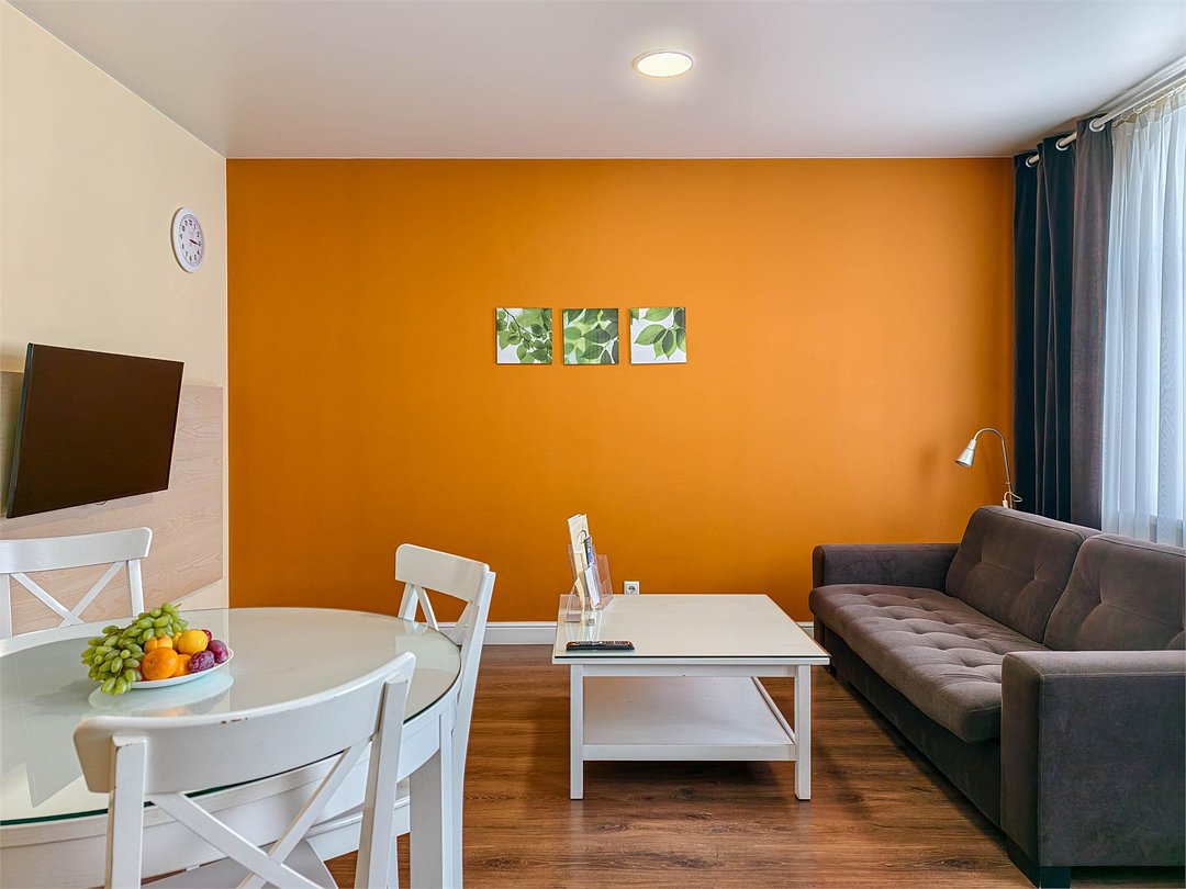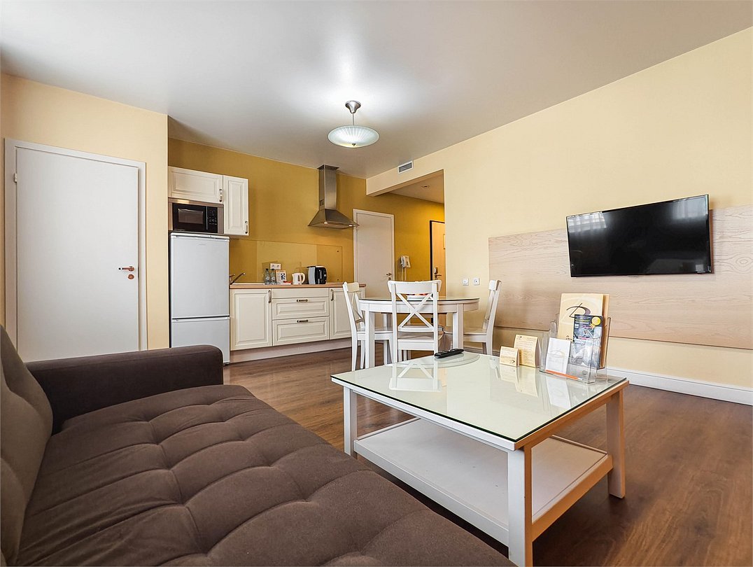 Это превосходные двухкомнатные апартаменты. В номерах просторная гостиная, уютная спальная комната с большой двуспальной кроватью, а также кухня, оснащенная всем необходимым для длительного проживания. Номер рассчитан на проживание 1-3 человек. Номера представлены в светло-зеленой, персиковой и сиреневой цветовой гамме.Услуги и удобства