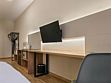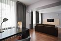 два телевизора, кабельное телевидение, интерактивное телевидение, Wi-Fi, телефон, холодильник, кондиционер, светильник, настольные лампы, фен, система безопасности, электронные замки, плита для приготовления пищи, кофемашина, микроволновая печь, утюг, душевая кабина, гигиенические средства, кровать «Queen size», гладильная доска, диван, стулья, шкаф для одежды, вешалки, журнальный столик, письменный стол, обеденный стол, багажная тумба, зеркало, кухня, письменные принадлежности, чайный набор, набор посуды, информационная карта, меню, сейф, стиральная машина, чайник, унитаз, раковина, мягкая мебель, косметическое зеркало, обеденная зона, гостиная зона, отопление, душ, вид на город, кабинет, плиточное покрытие, кресло, вид во двор, паркетВ гостиничном номере