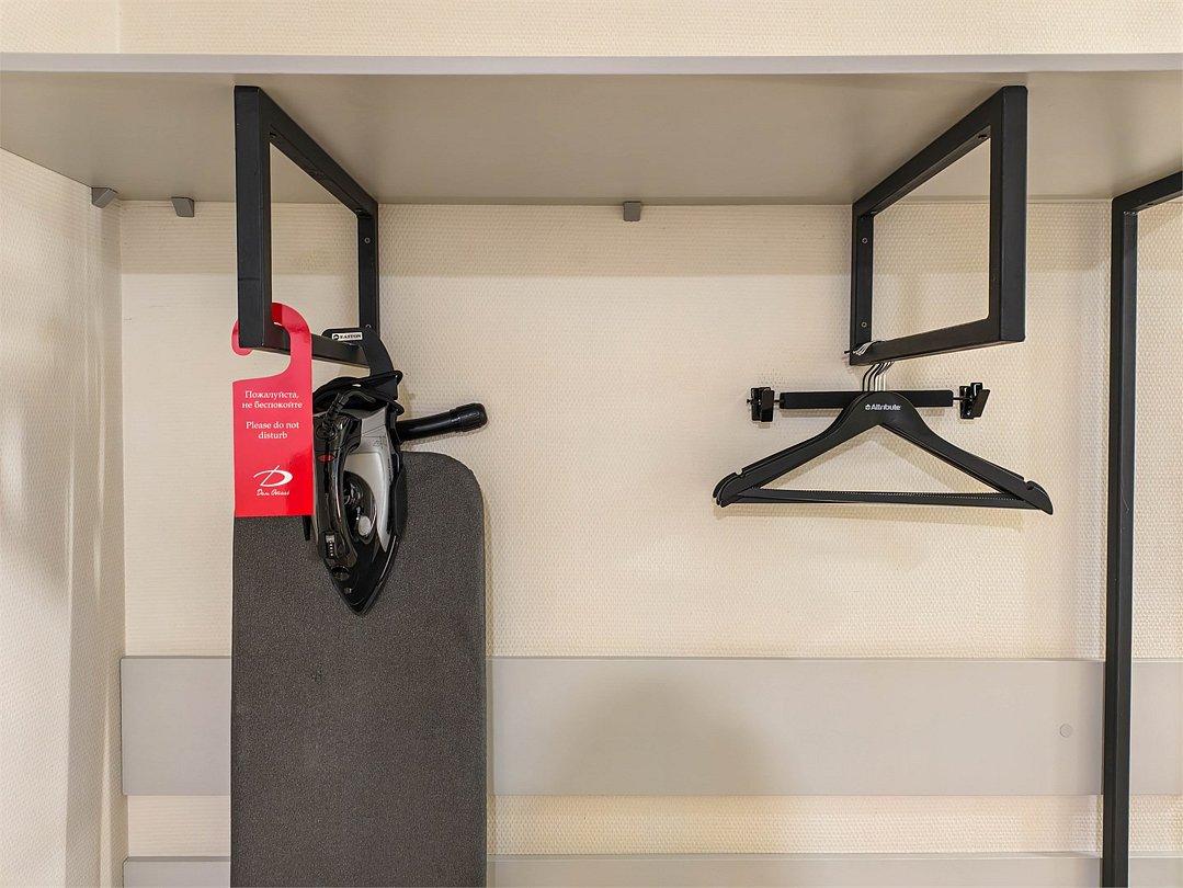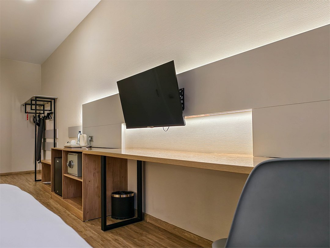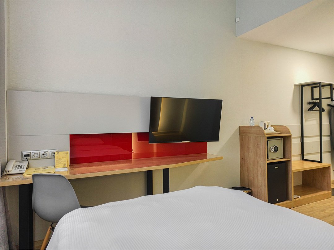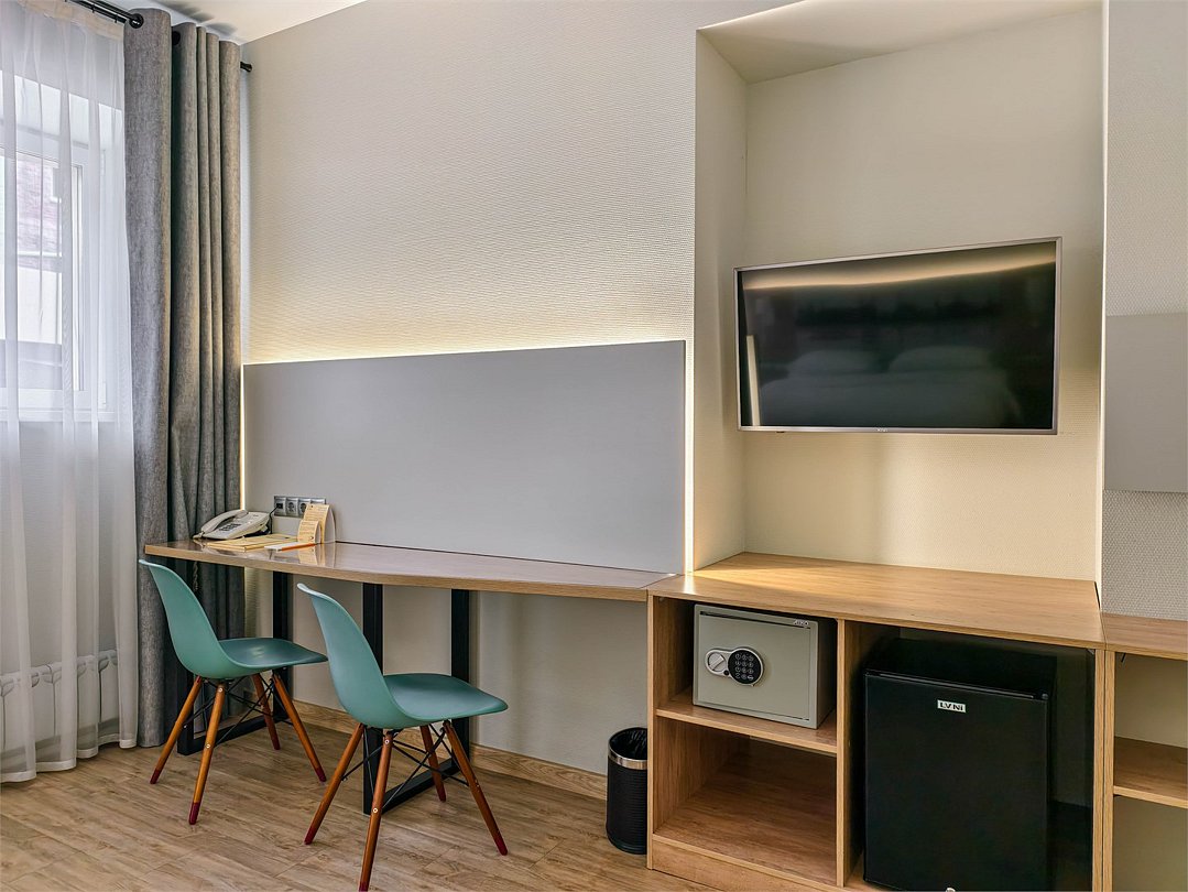 Wi-Fi, интернет, телефон, светильник, фен, система безопасности, электронные замки, утюг, ванная комната, душевая кабина, ванна или душевая кабина, санузел, банные полотенца, тапочки, двуспальная кровать, гладильная доска, гардеробная, вешалки, багажная тумба, зеркало, чайный набор, информационная карта, меню, сейф, чайник, унитаз, раковина, косметическое зеркало, отопление, душ, кулер на этаже, вид во двор, стаканы, стул, тумба, туалет, цифровое тв, внутренний телефон, мини-холодильник, гостиничная парфюмерия, телевизор со Smart TV, номер для некурящих, рабочий стол, чайная станцияВ гостиничном номере