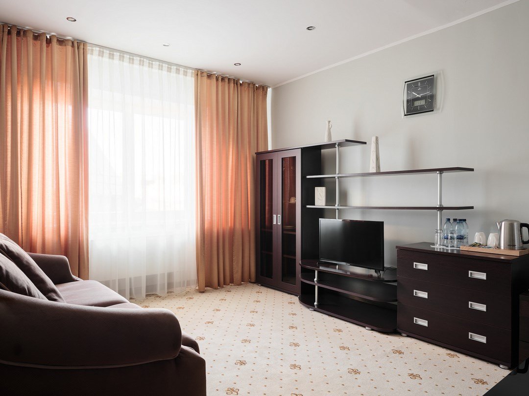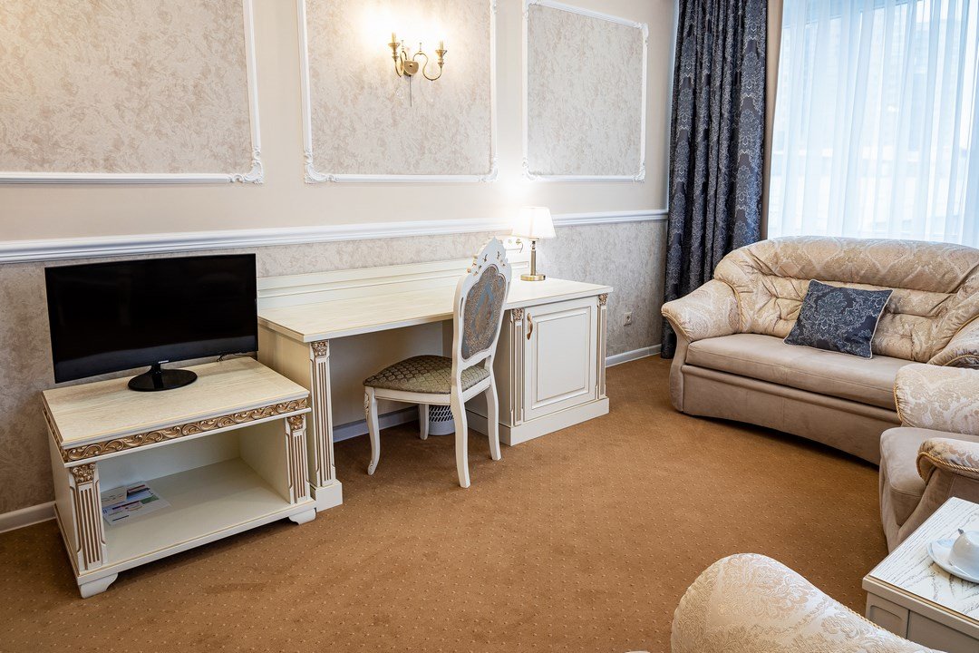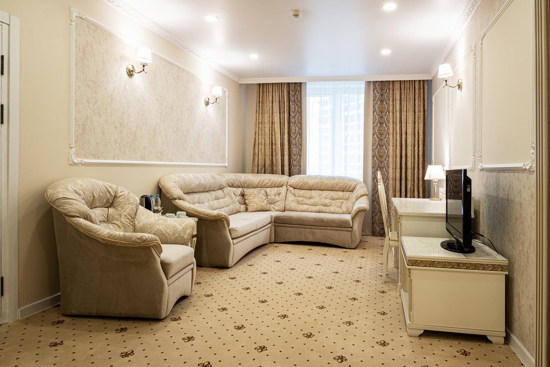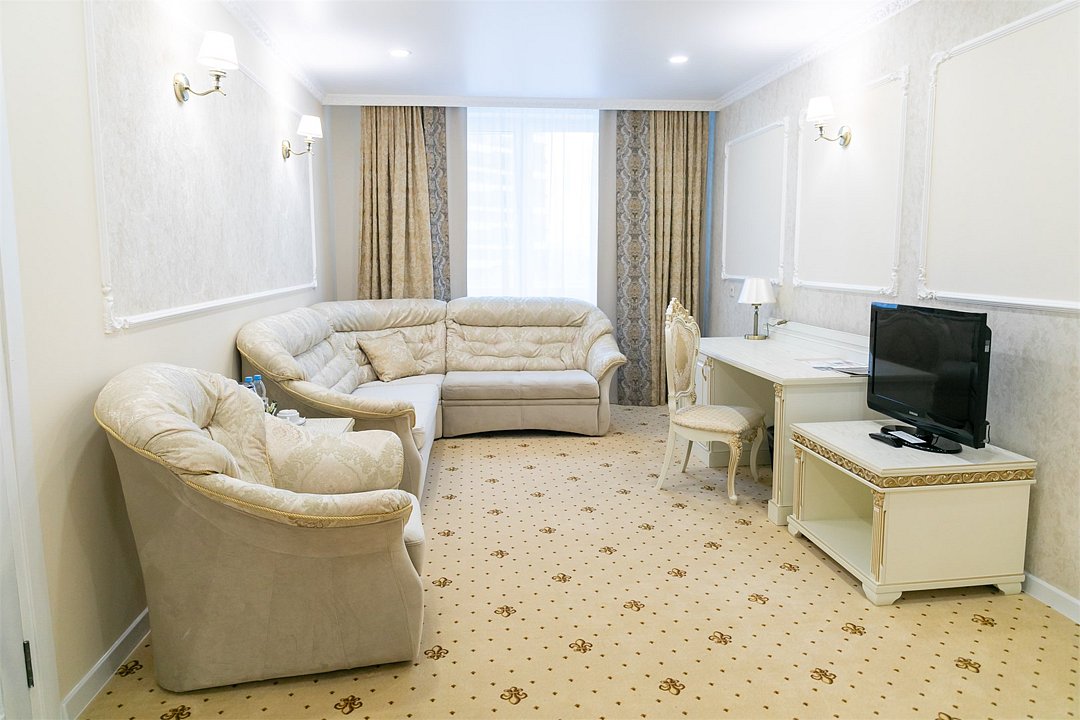 два телевизора, кабельное телевидение, музыкальный центр, Wi-Fi, телефон, холодильник, кондиционер, светильник, настольные лампы, фен, весы, электронные замки, обогреватель, ванная комната, ванна, ванна или душевая кабина, биде, теплый пол, банные принадлежности, халаты, банные полотенца, тапочки, гигиенические средства, косметические средства, кровать «Queen size», диван, кресла, тумбы, стулья, шкаф для одежды, вешалки, журнальный столик, письменный стол, зеркало, комод, пуфики, эксклюзивная мебель, две комнаты, звуконепроницаемые стены и окна, мини-бар, чайный набор, обслуживание номеров, информационная карта, меню, сейф, чайник, унитаз, раковина, мягкая мебель, питьевая вода, гостиная зона, ковровое покрытие, отопление, вид на город, кулер на этаже, плиточное покрытие, можно с питомцамиВ гостиничном номере