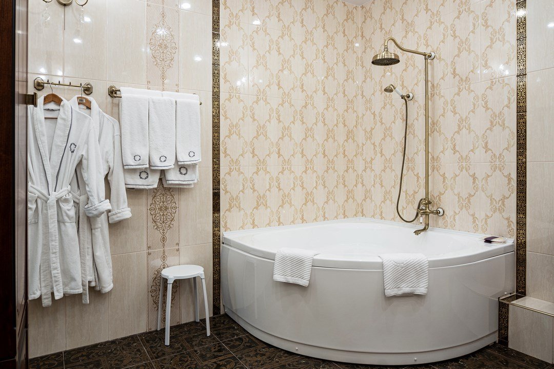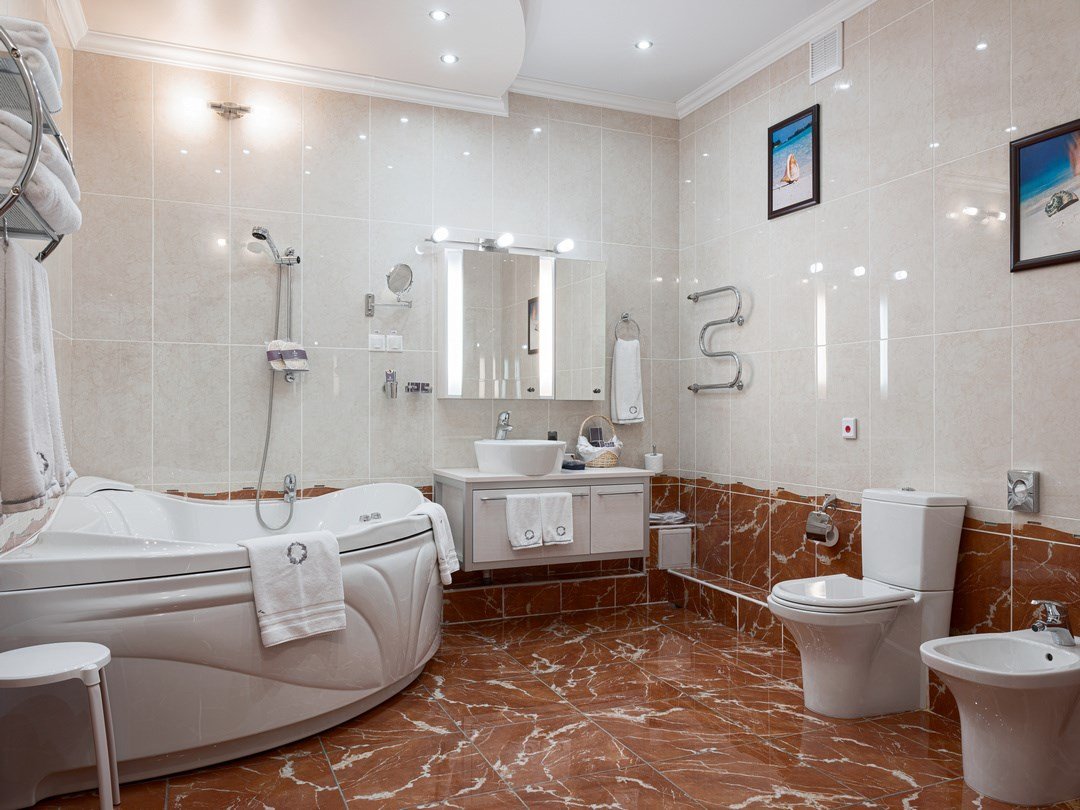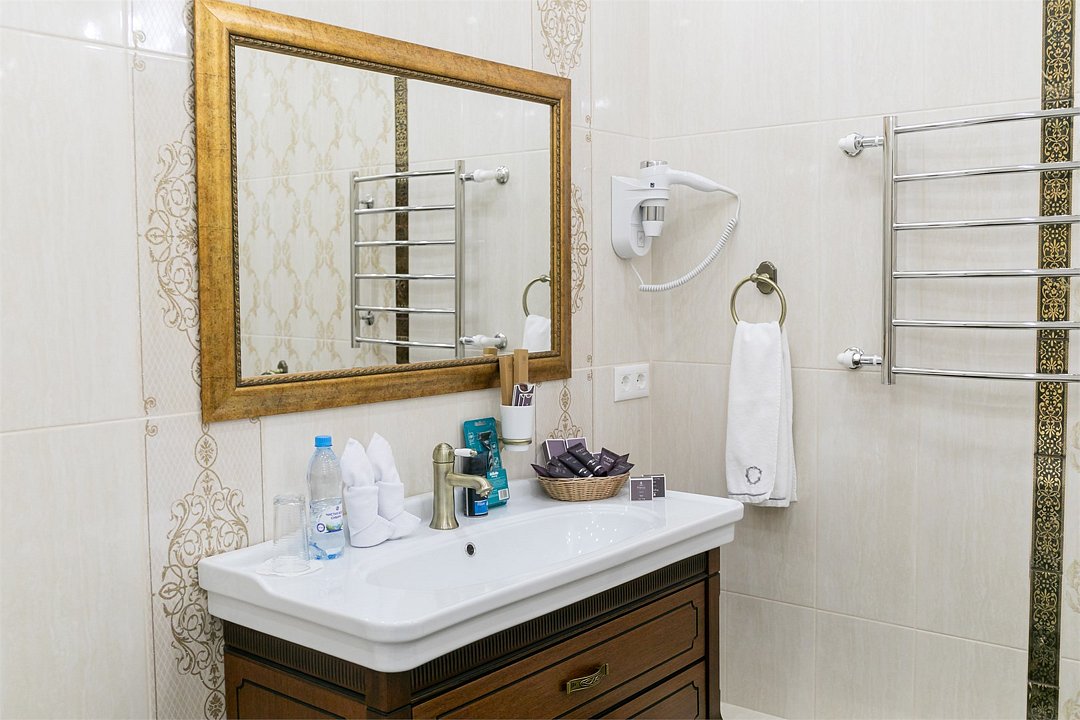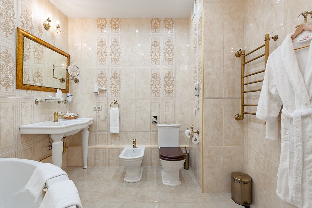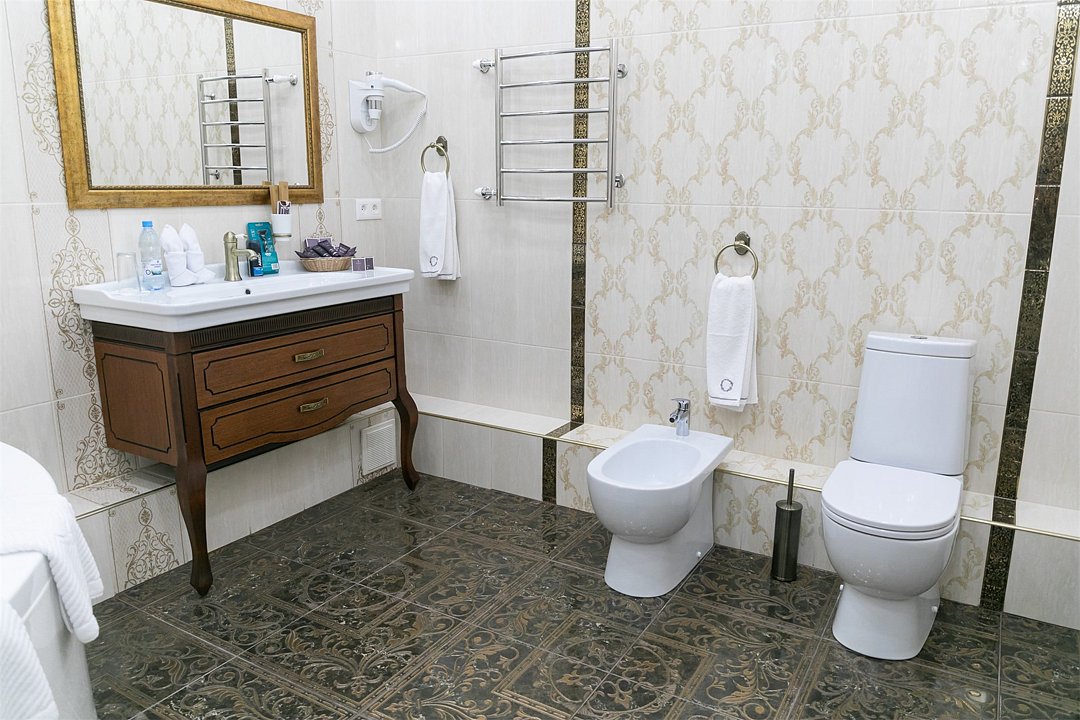 два телевизора, кабельное телевидение, музыкальный центр, Wi-Fi, телефон, холодильник, кондиционер, светильник, настольные лампы, фен, весы, электронные замки, обогреватель, ванная комната, ванна, ванна или душевая кабина, биде, теплый пол, банные принадлежности, халаты, банные полотенца, тапочки, гигиенические средства, косметические средства, кровать «Queen size», диван, кресла, тумбы, стулья, шкаф для одежды, вешалки, журнальный столик, письменный стол, зеркало, комод, пуфики, эксклюзивная мебель, две комнаты, звуконепроницаемые стены и окна, мини-бар, чайный набор, обслуживание номеров, информационная карта, меню, сейф, чайник, унитаз, раковина, мягкая мебель, питьевая вода, гостиная зона, ковровое покрытие, отопление, вид на город, кулер на этаже, плиточное покрытие, можно с питомцамиВ гостиничном номере