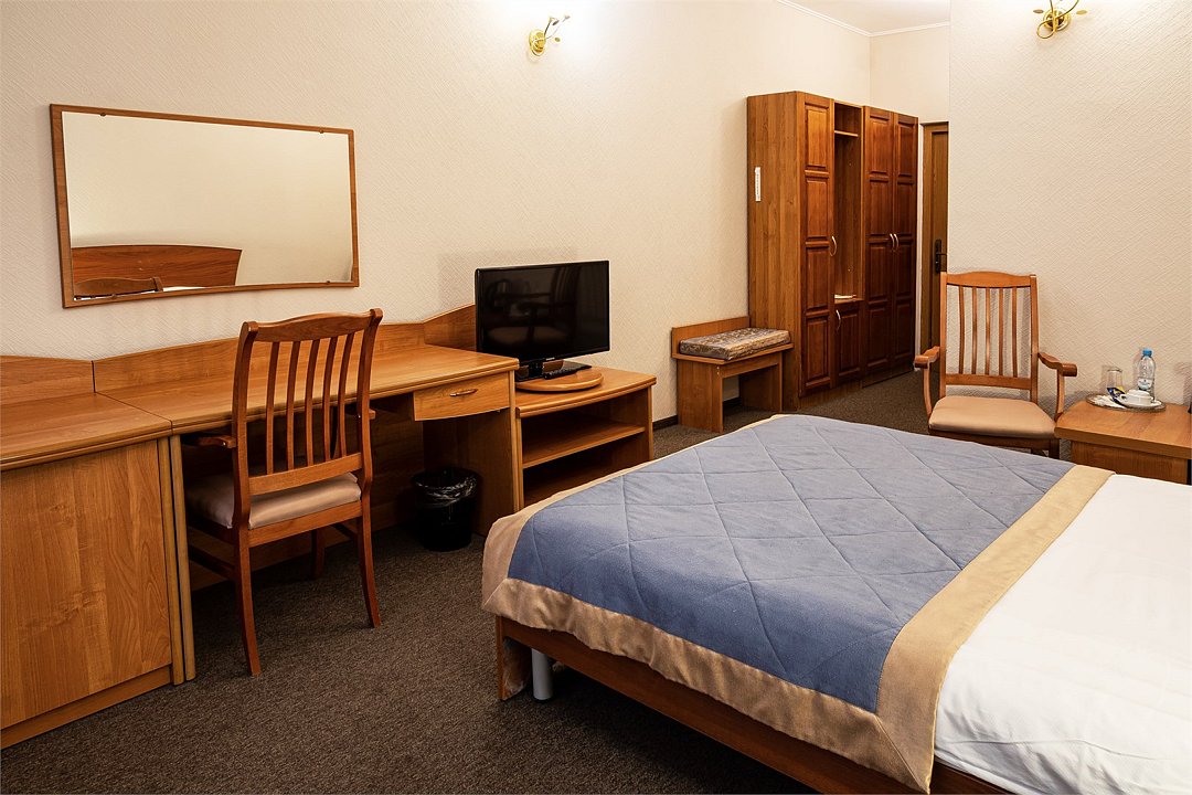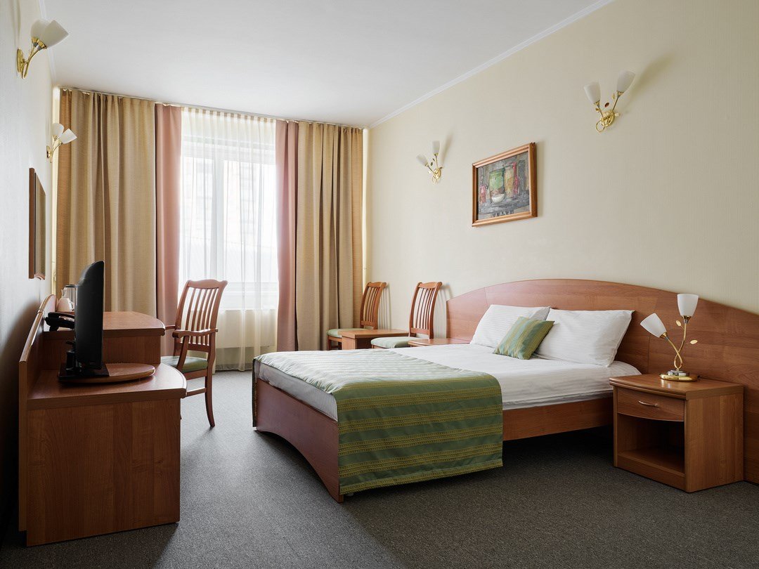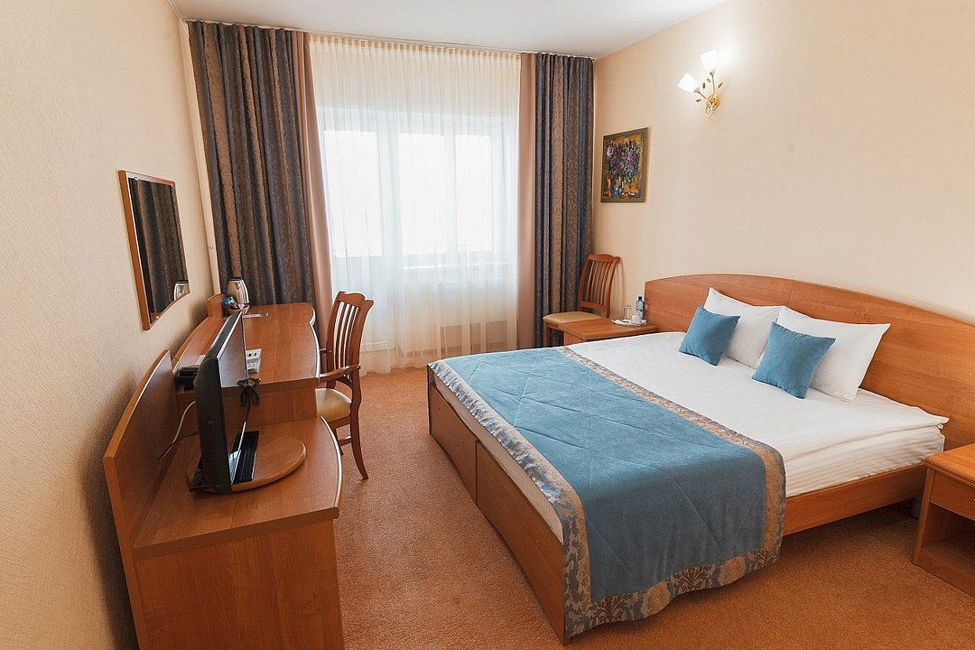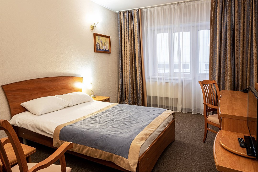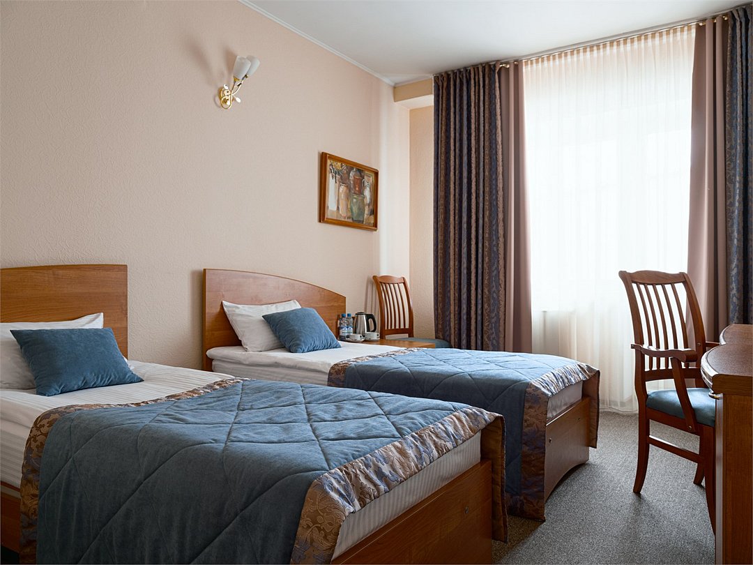 Площадь номера от 20 кв.м. Простор и современный интерьер удивят Вас своей функциональностью и комфортом, а точность цветового решения наполняют номера - светом и теплом. В номере: телевизор, телефон, возможность выхода в Интернет, мини-холодильник, ванная комната оснащенная феном и туалетными принадлежностями. Двуспальная кровать-трансформер имеет возможность комплектации на два отдельных спальных места.Услуги и удобства