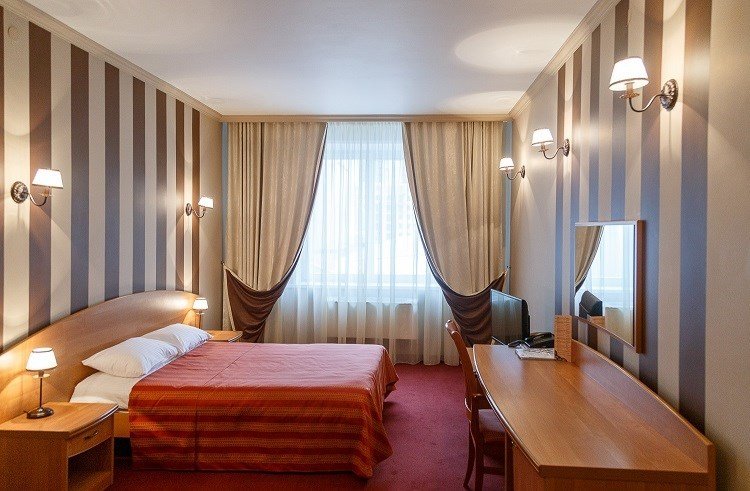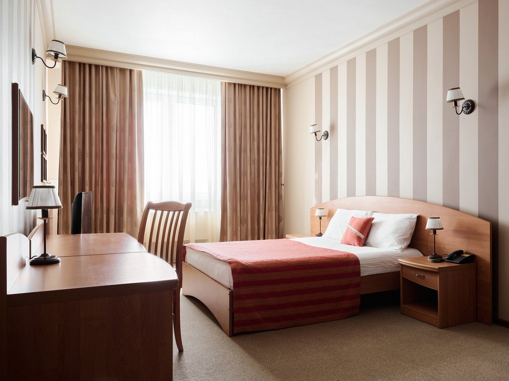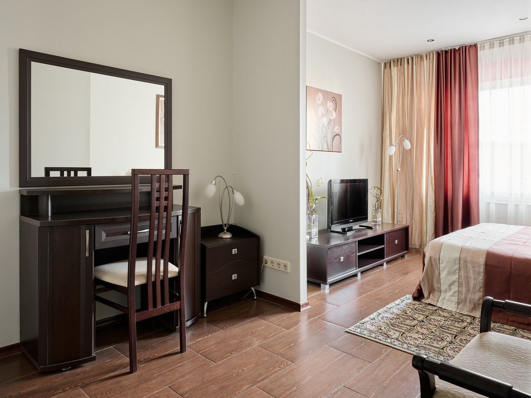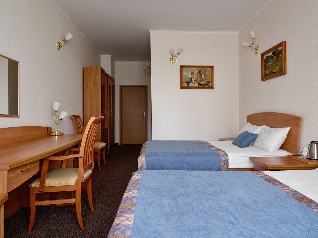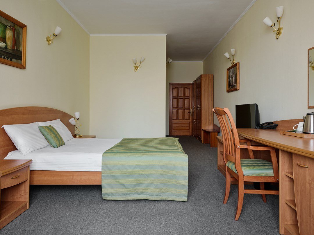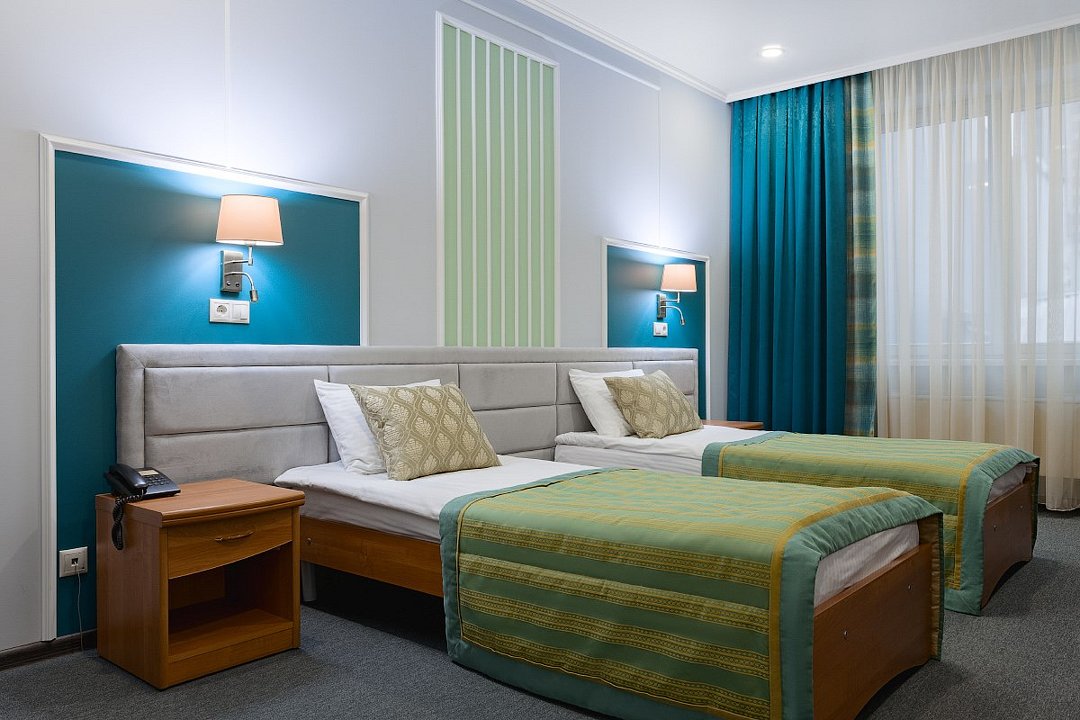 Площадь номера от 20 кв.м. Простор и современный интерьер удивят Вас своей функциональностью и комфортом, а точность цветового решения наполняют номера - светом и теплом. В номере: телевизор, телефон, возможность выхода в Интернет, мини-холодильник, ванная комната оснащенная феном и туалетными принадлежностями. Двуспальная кровать-трансформер имеет возможность комплектации на два отдельных спальных места.Услуги и удобства