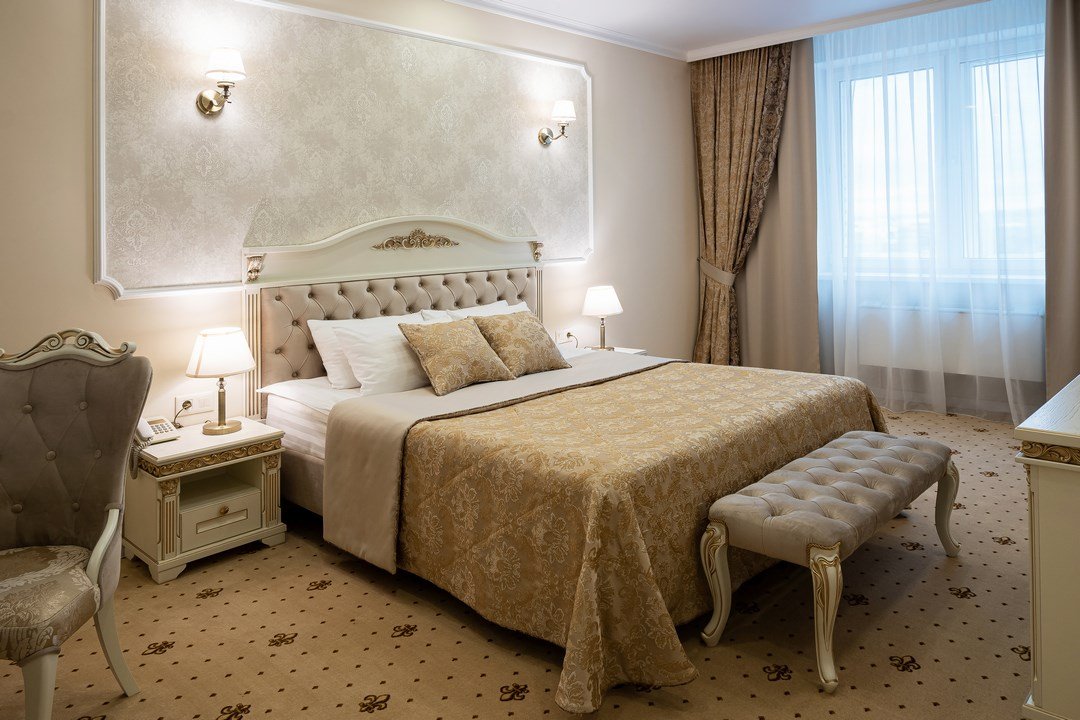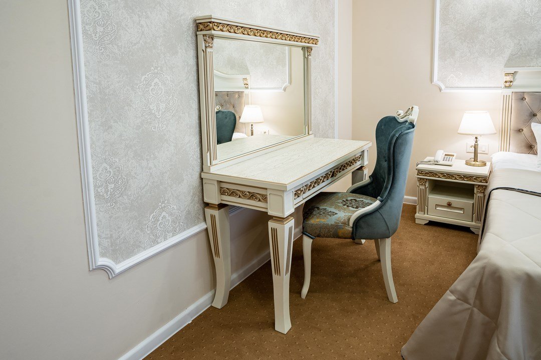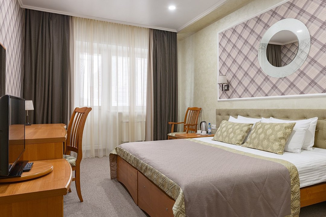 телевизор, кабельное телевидение, Wi-Fi, телефон, холодильник, кондиционер, светильник, настольные лампы, фен, весы, электронные замки, обогреватель, ванная комната, ванна или душевая кабина, биде, халаты, банные полотенца, тапочки, гигиенические средства, косметические средства, кровать «Queen size», кресла, тумбы, шкаф для одежды, вешалки, журнальный столик, письменный стол, зеркало, звуконепроницаемые стены и окна, чайный набор, обслуживание номеров, информационная карта, меню, чайник, унитаз, раковина, питьевая вода, ковровое покрытие, отопление, вид на город, кулер на этаже, туалетные средства, номер для некурящих, услуги прачечной (платно), вешалки-плечики, можно с питомцамиВ гостиничном номере