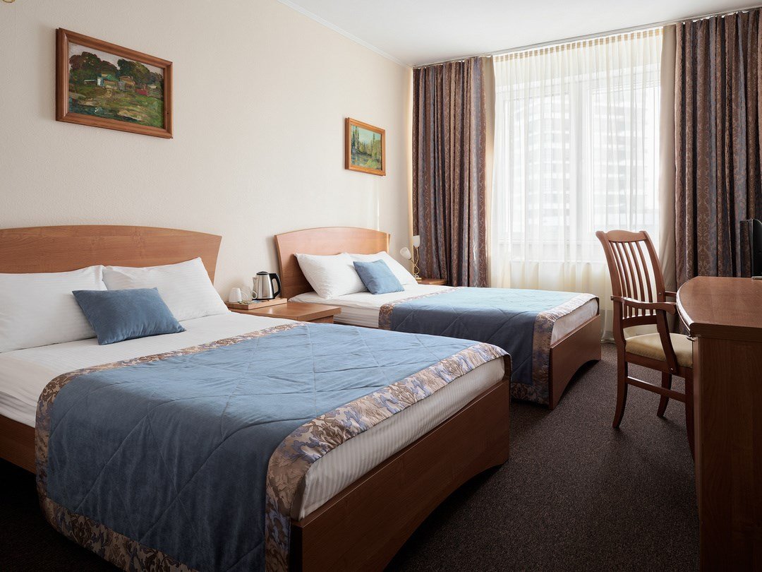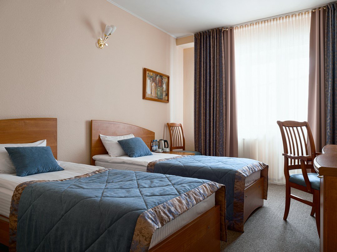 телевизор, кабельное телевидение, Wi-Fi, телефон, холодильник, кондиционер, фен, весы, электронные замки, обогреватель, ванная комната, ванна, халаты, банные полотенца, тапочки, гигиенические средства, косметические средства, две односпальные кровати, стулья, шкаф для одежды, вешалки, зеркало, звуконепроницаемые стены и окна, обслуживание номеров, информационная карта, меню, чайник, унитаз, раковина, питьевая вода, ковровое покрытие, вид на город, кулер на этаже, можно с питомцамиВ гостиничном номере