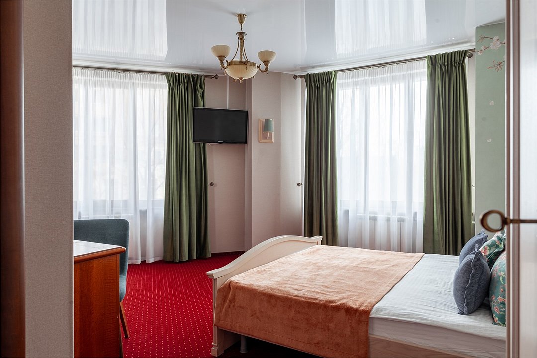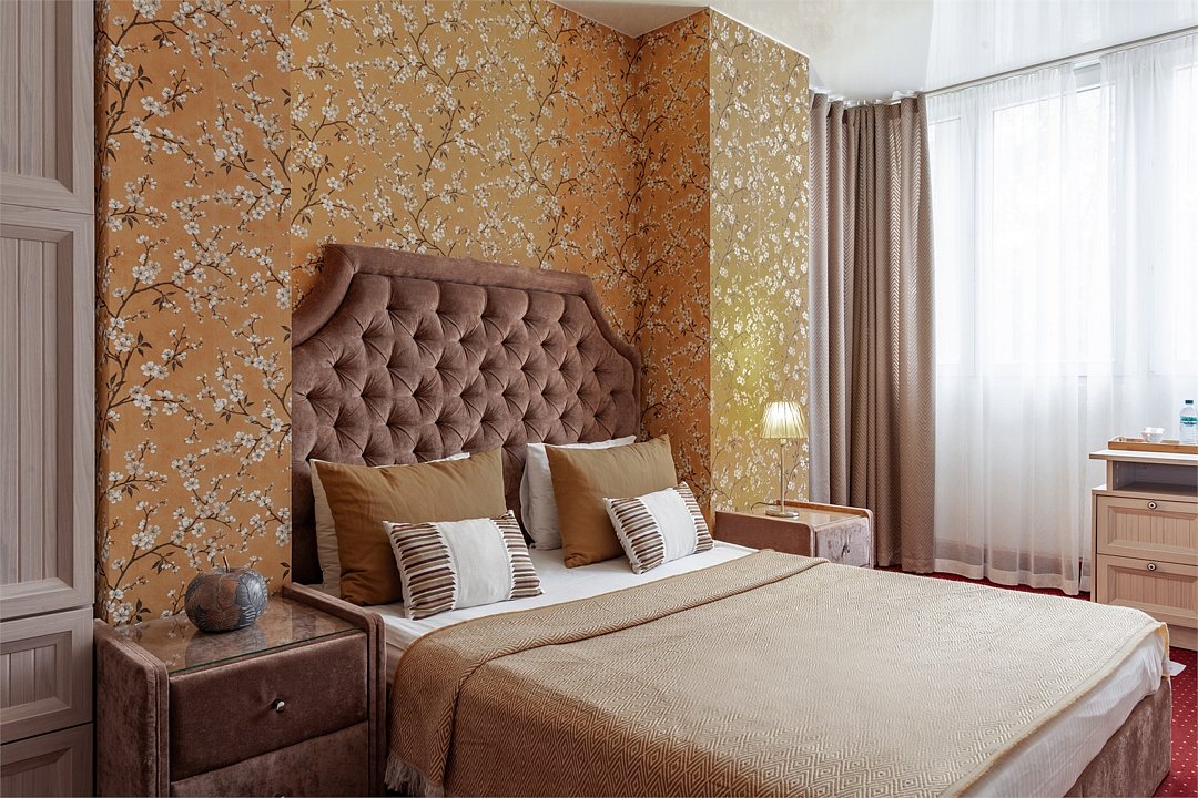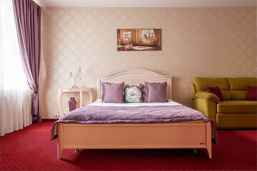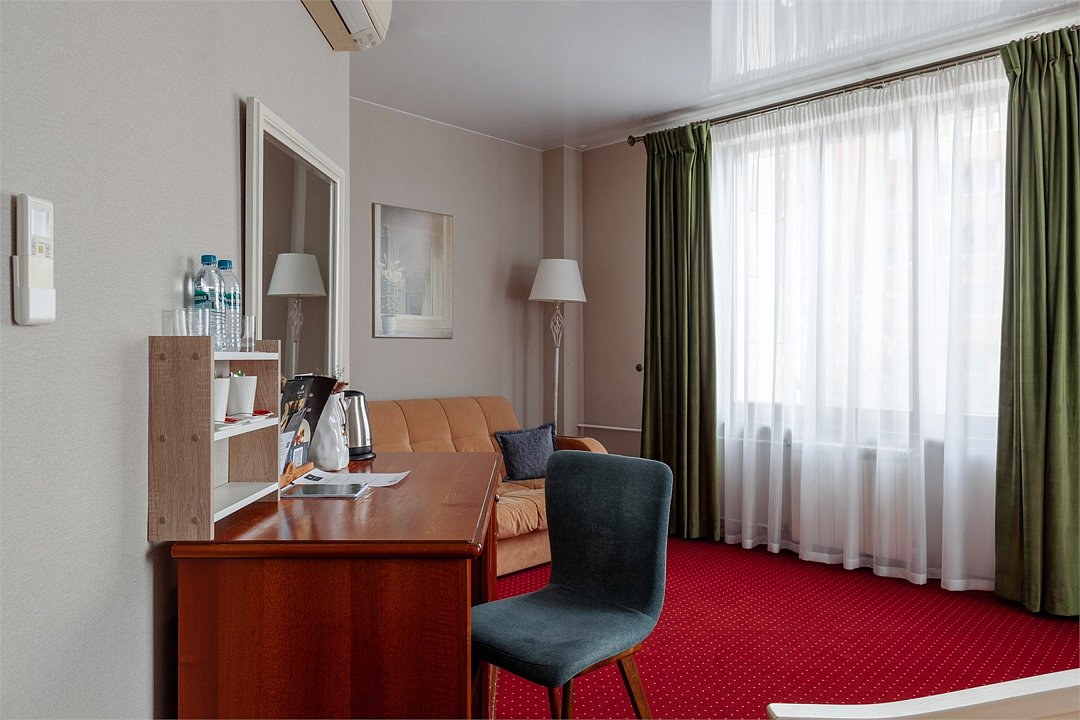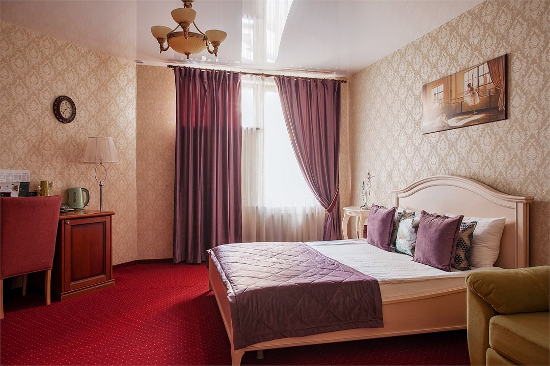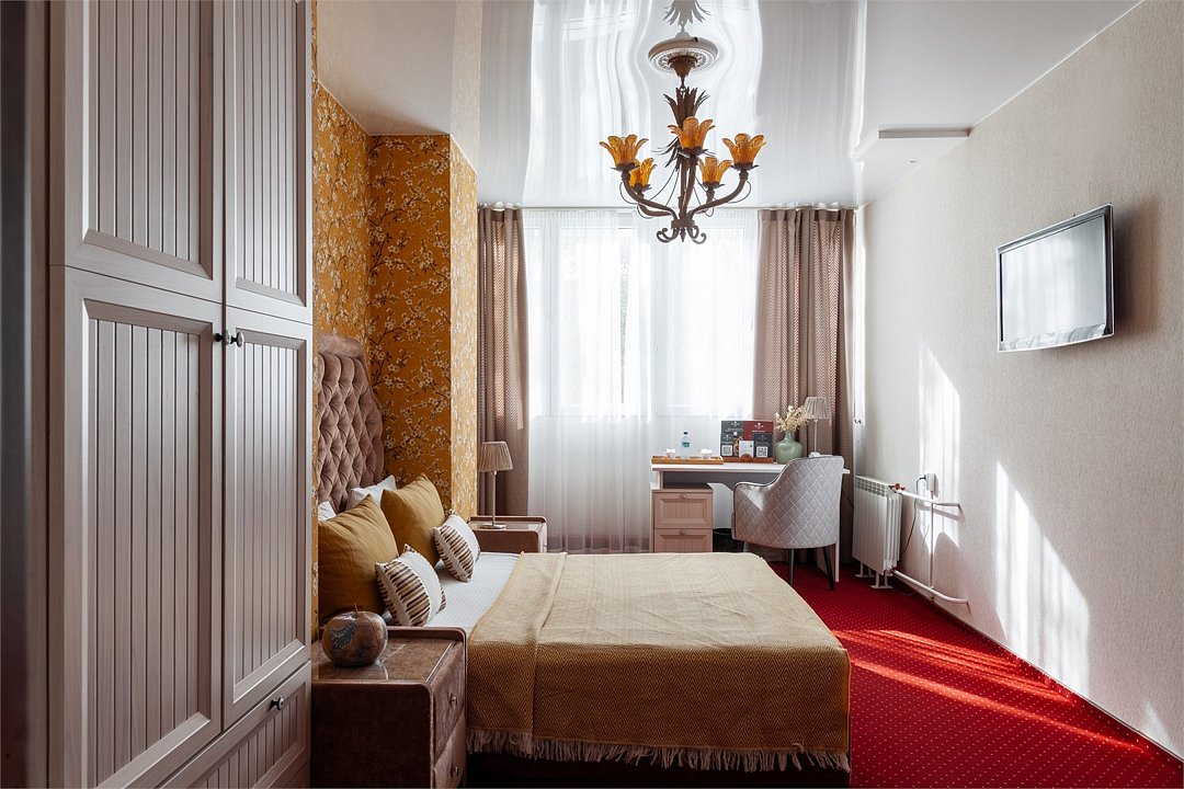 "Улучшенный комфорт" это шикарные светлые номера с двумя окнами и замачательным видом из окна на парк "Сады Мечты". В номере установлен диван-кровать, который с легкостью трансформируется в спальное место и позволит с комфортом разместиться даже трем гостям! В номере для Вашего удобства имеется три зоны: гардеробная, чтобы Вы могли аккуратно разложить все ваши вещи; рабочая зона, оборудованная письменным столом и креслом, чтобы Вы смогли продуктивно поработать в тишине; и, конечно же, зона отдыха с шикарной кроватью, ортопедический матрас на которой обеспечит Вам полноценный и здоровый сон! Для Вас всегда наполнен мини-бар, наглажен халат и подготовлены мягкие тапочки, приготовлен чай и вкусности – для того, чтобы Вы, действительно, смогли отдохнуть в нашем уютном отеле.Услуги и удобства