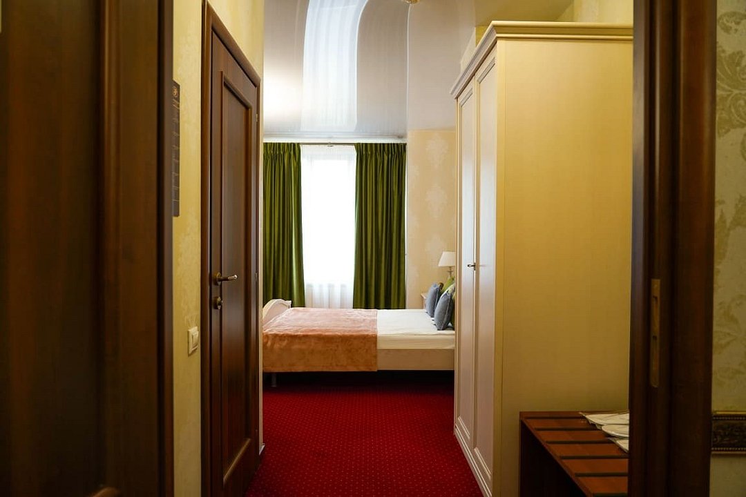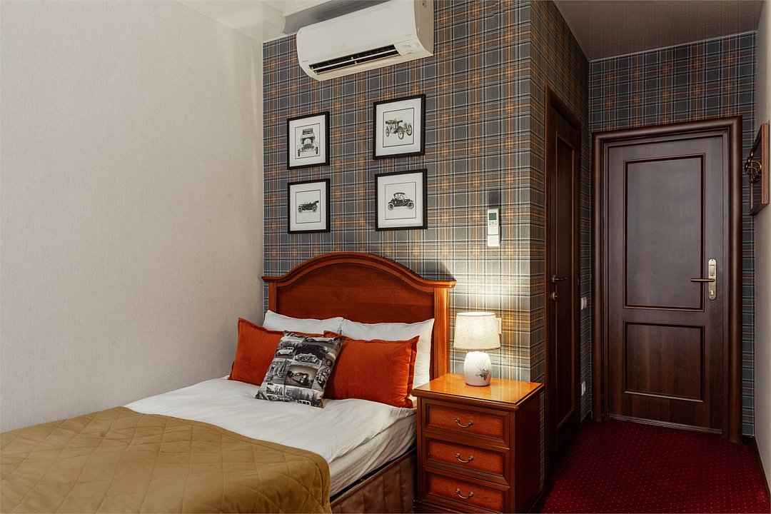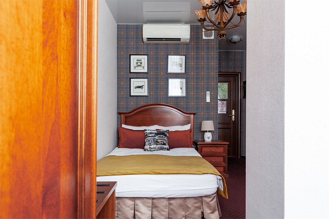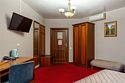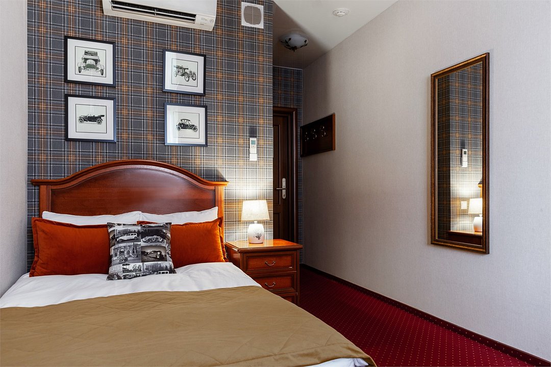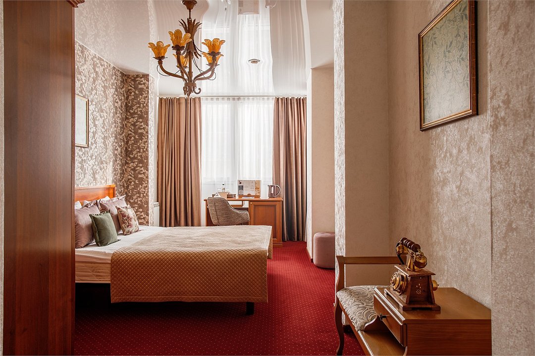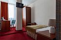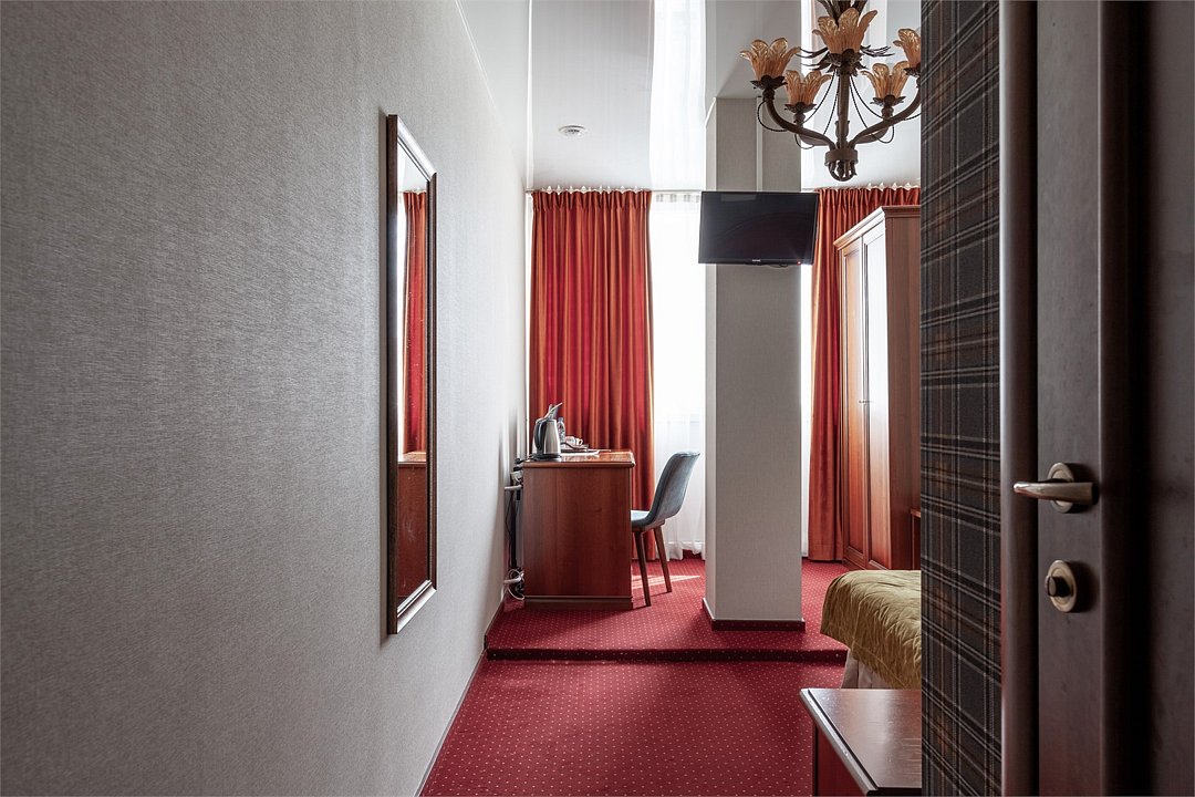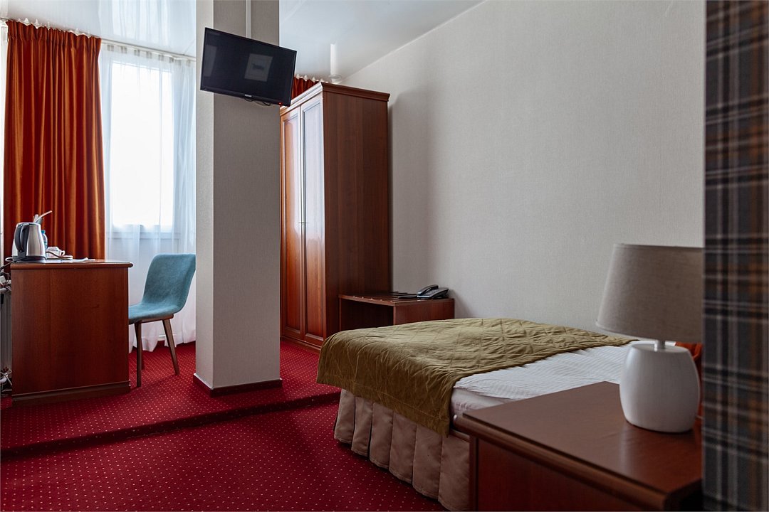 Стандарт – одноместный номер с собственной ванной комнатой, общей площадью 18 кв. м. Номер оснащен полутороспальной кроватью с удобными ортопедическими матрасом, письменным столом и телевизором! В мини-баре для Вас подготовлены прохладительные напитки и снэки! В ванной комнате для Вас отглажен теплый махровый халат и мягкие тапочки!Услуги и удобства