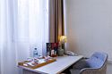 телевизор, кабельное телевидение, Wi-Fi, интернет, телефон, кондиционер, светильник, настольные лампы, фен, весы, система безопасности, электронные замки, утюг, ванная комната, душевая кабина, ванна, ванна или душевая кабина, санузел, водонагреватель, халаты, банные полотенца, тапочки, гигиенические средства, косметические средства, двуспальная кровать, гладильная доска, тумбы, стулья, шкаф для одежды, гардеробная, вешалки, письменный стол, багажная тумба, зеркало, пуфики, мини-бар, письменные принадлежности, чайный набор, обслуживание номеров, информационная карта, меню, сейф, чайник, унитаз, питьевая вода, ковровое покрытие, отопление, душ, вид на город, кулер на этаже, кресло, высокие потолки, стаканы, стул, стол, тумба, туалетные средства, туалет, мини-холодильник, гостиничная парфюмерия, номер для некурящих, usb порт, пуфикВ гостиничном номере