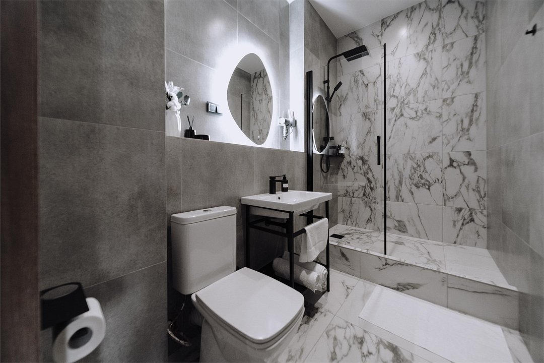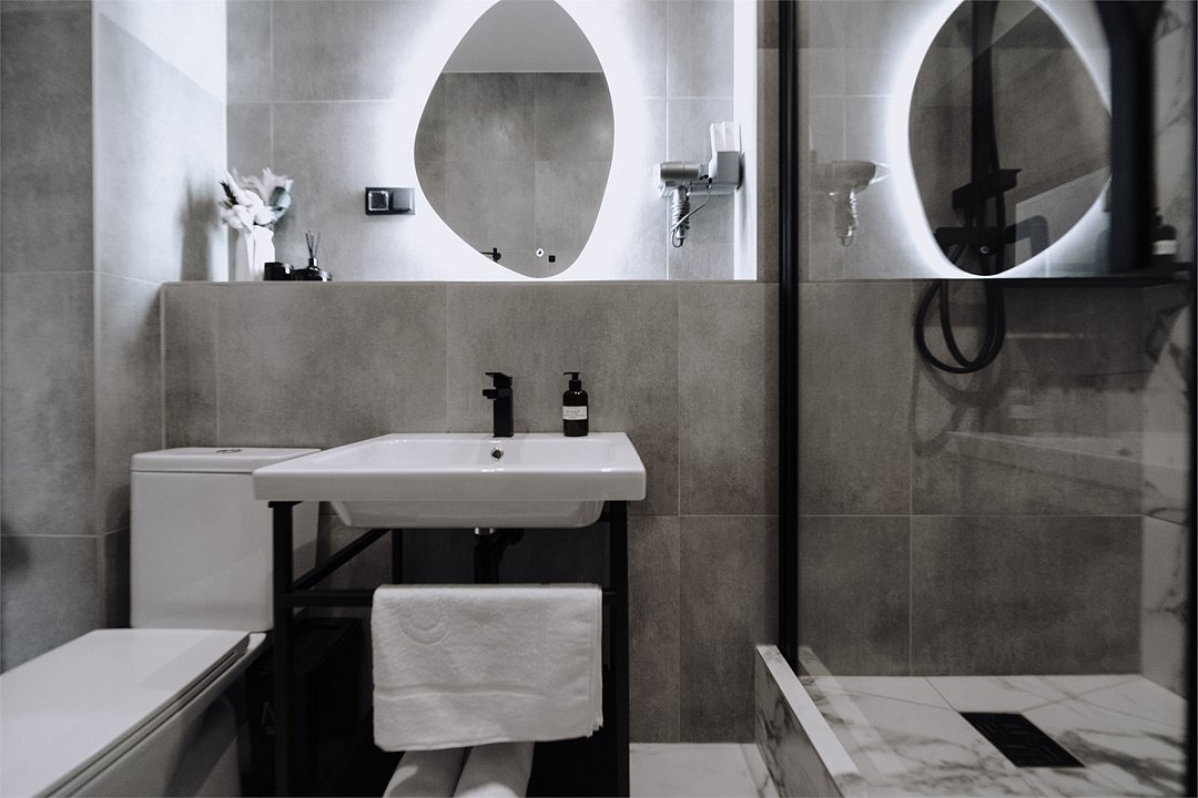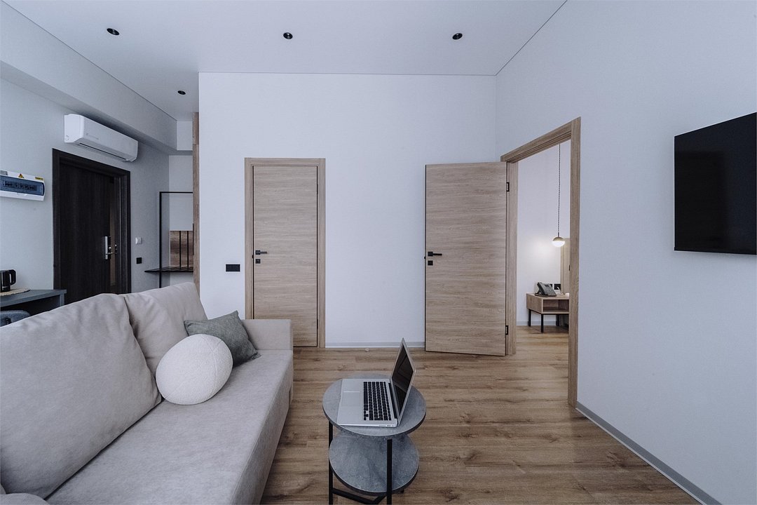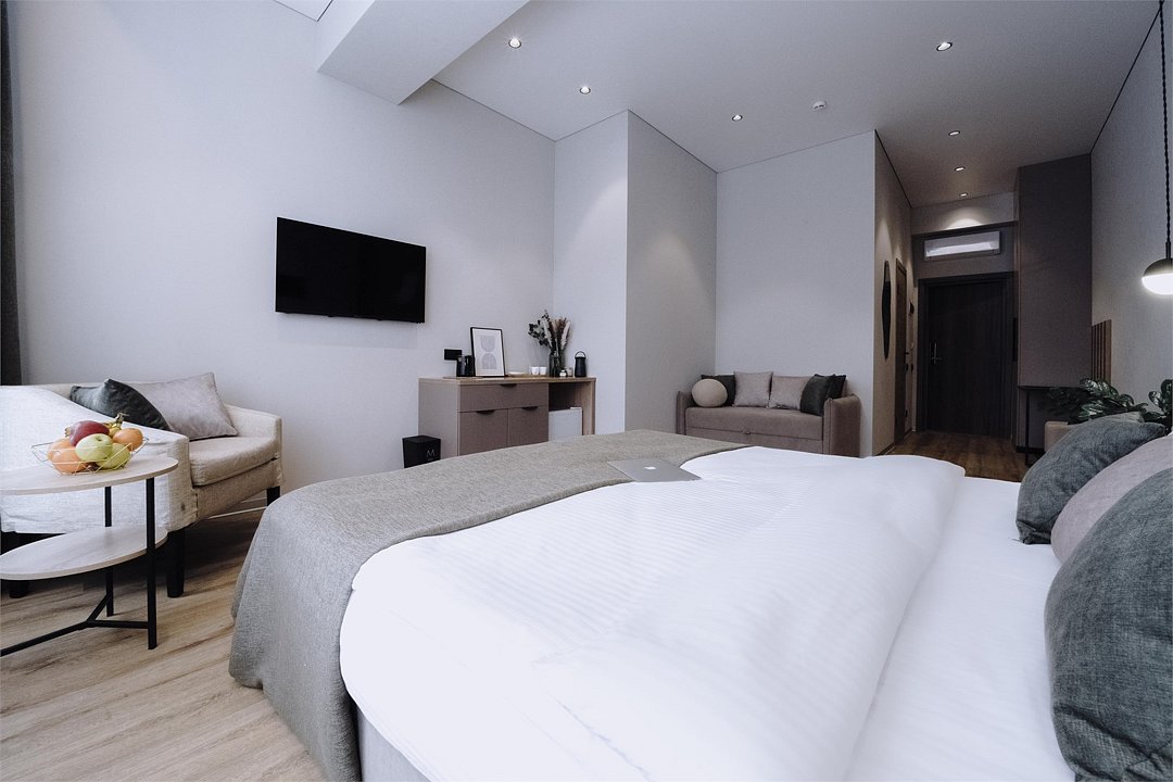 два телевизора, Wi-Fi, кондиционер, фен, электронные замки, утюг, душевая кабина, водонагреватель, халаты, банные полотенца, тапочки, двуспальная кровать, стулья, шкаф для одежды, вешалки, журнальный столик, багажная тумба, комод, чайный набор, чайник, унитаз, мягкая мебель, вид на город, вид во двор, стаканы, стул, туалетные средства, диван-кровать, раскладной диван, внутренний телефон, мини-холодильник, телевизор со Smart TV, номер для некурящих, usb порт, пуфик, рабочий стол, угловой диван-кровать, чайная станция, уборка номера, вешалки-плечики, бутилированная вода, мини-бар (платно), мыло, затемняющая штора, зеркало в полный рост, можно с питомцами, тропический душВ номере