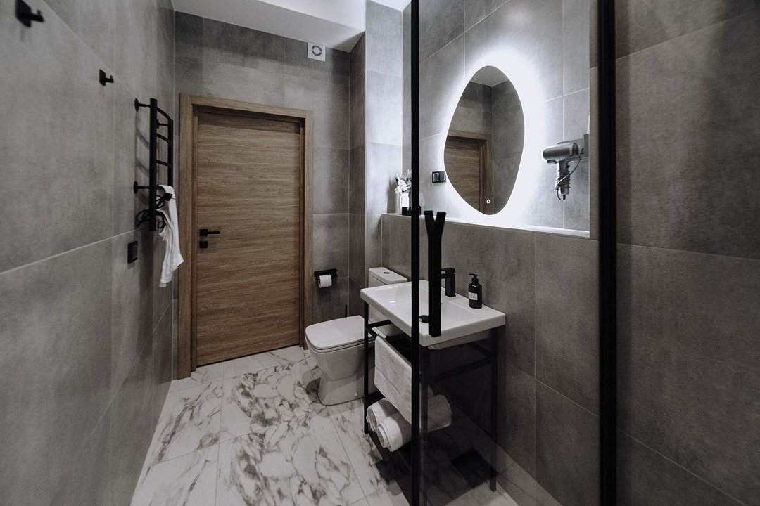 Wi-Fi, кондиционер, фен, электронные замки, утюг, душевая кабина, водонагреватель, халаты, тапочки, двуспальная кровать, шкаф для одежды, вешалки, журнальный столик, багажная тумба, зеркало, мини-бар, чайный набор, сейф, чайник, унитаз, раковина, отопление, вид на город, кресло, стул, туалетный столик, внутренний телефон, мини-холодильник, телевизор со Smart TV, номер для некурящих, usb порт, пуфик, рабочий стол, чайная станция, вешалки-плечики, бутилированная вода, частный двор, зеркало в полный рост, можно с питомцами, тропический душВ номере