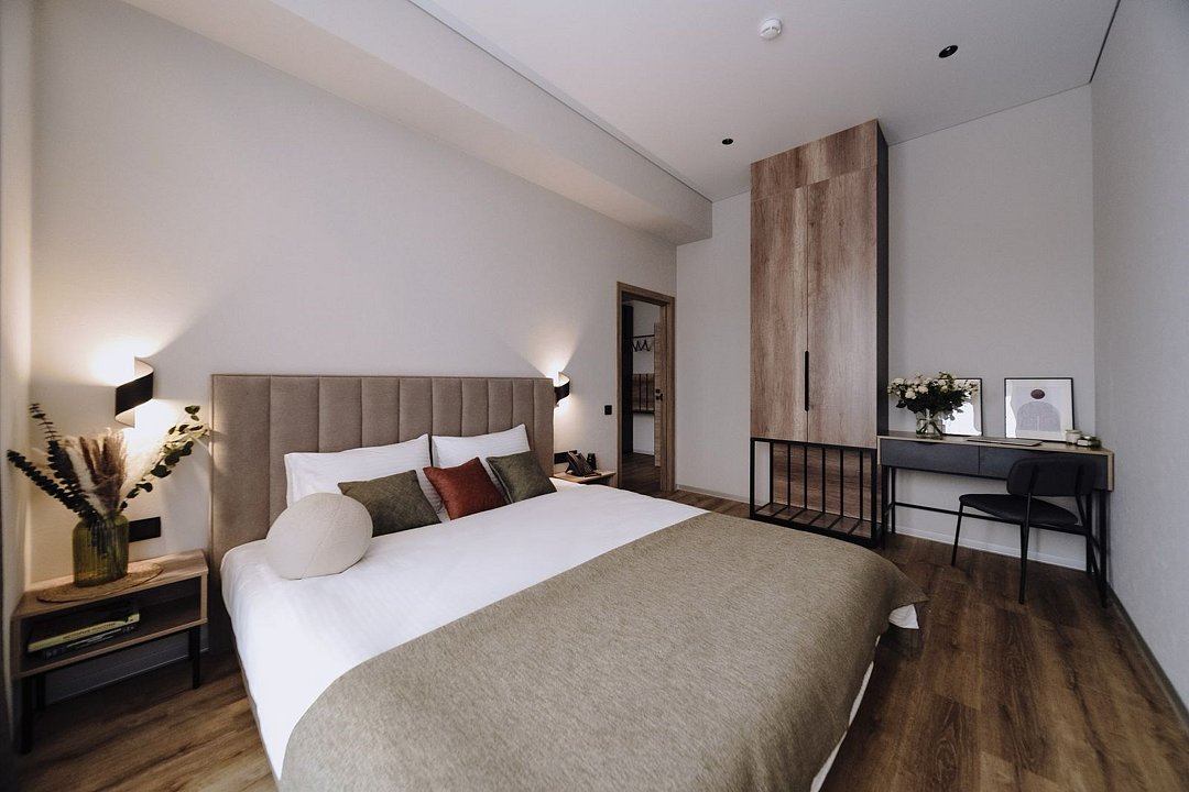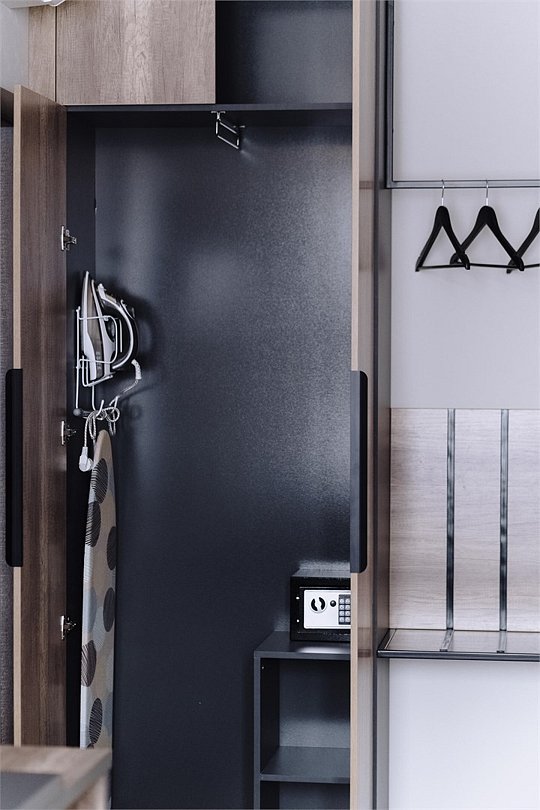Wi-Fi, кондиционер, фен, электронные замки, утюг, водонагреватель, халаты, банные полотенца, тапочки, двуспальная кровать, шкаф для одежды, вешалки, журнальный столик, багажная тумба, зеркало, чайный набор, чайник, унитаз, душ, вид на город, кресло, вид во двор, стул, туалетные средства, диван-кровать, раскладной диван, внутренний телефон, мини-холодильник, телевизор со Smart TV, номер для некурящих, usb порт, пуфик, рабочий стол, чайная станция, вешалки-плечики, бутилированная вода, мини-бар (платно), мыло, затемняющая штора, зеркало в полный рост, можно с питомцами, тропический душВ номере