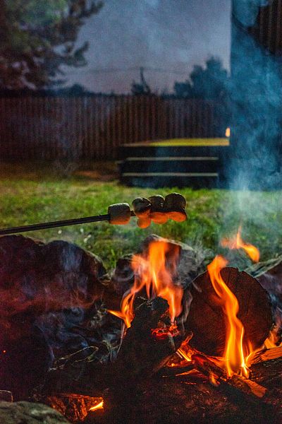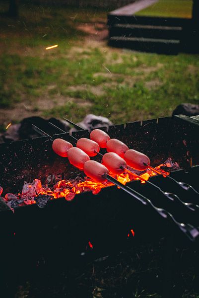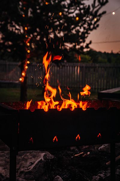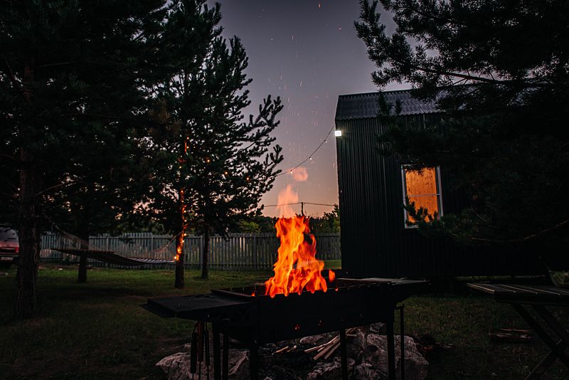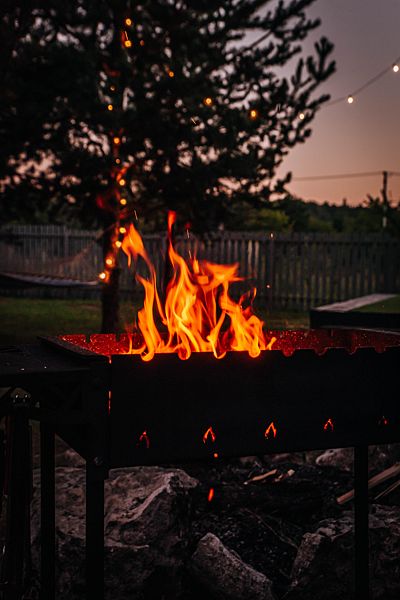 Мангал находится в безопасной зоне у костровища, обнесенного камнями. Затушите угли и пламя после использования мангала.