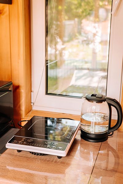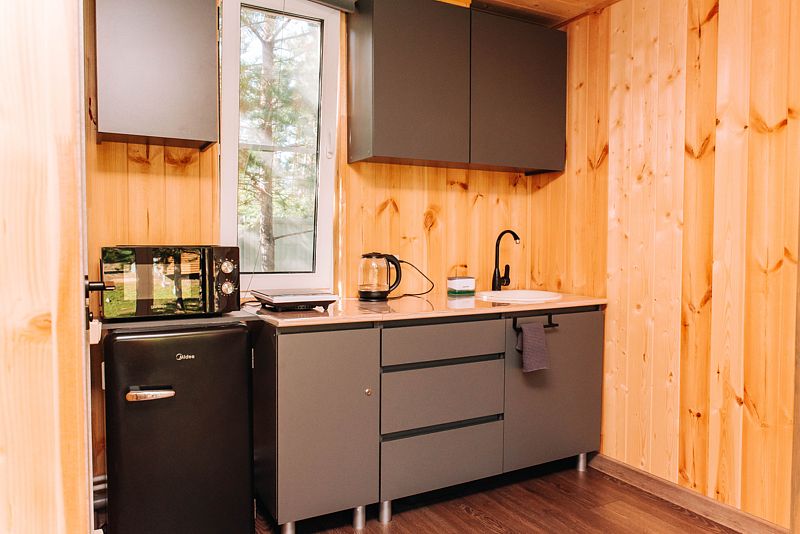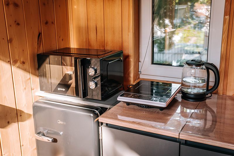 - Кухонная зона с микроволновкой, холодильником, индукционной плитой со всех посудой (тарелки, бокалы, фужеры, заварочник, кастрюля, сковородка), а так же чай, кофе, сахар, соль, масло, макароны, мука и прочее.