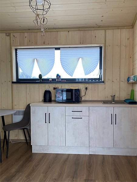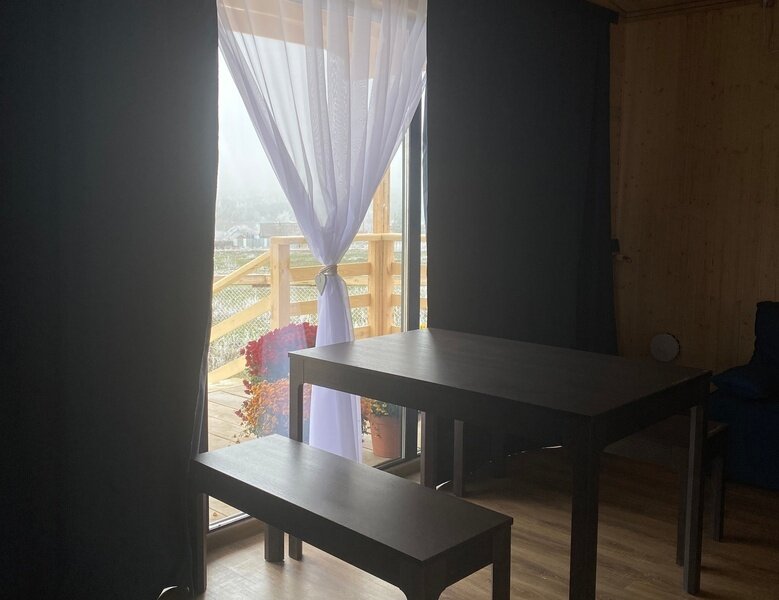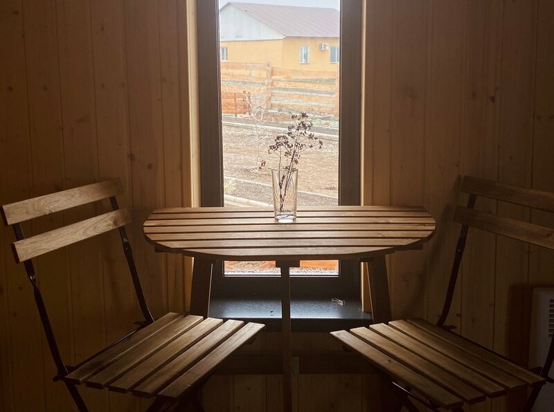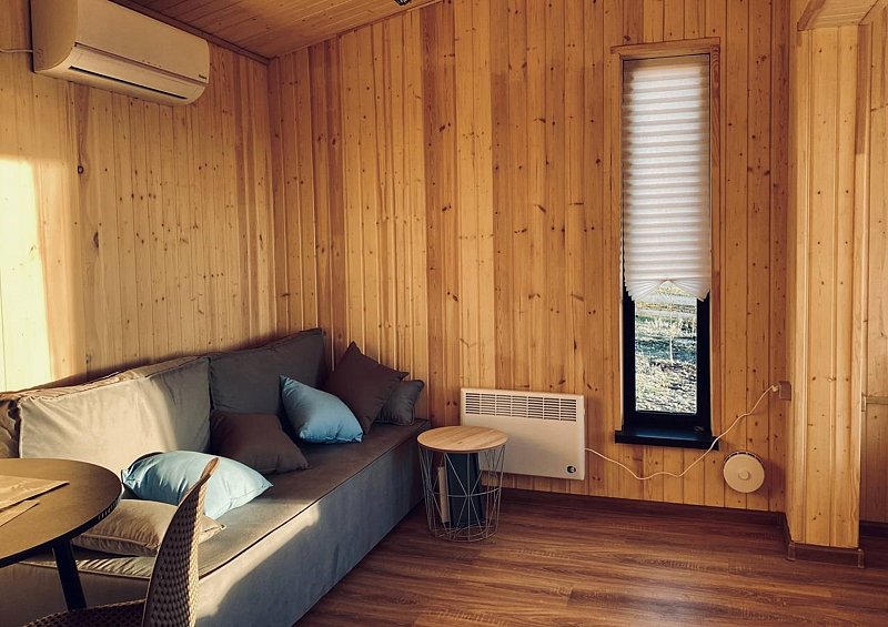 Дом Вереск с отдельной спальней и большим панорамным окном в гостиной. В доме кухня-гостиная, компактная спальня, санузел, веранда с мебелью. В гостиной комфортный диван-кровать и кресло-кровать, обеденный гарнитур, журнальный стол, торшер. Кухня полностью оборудована техникой и посудой ( холодильник, плита, микроволновая печь, чайник). Перед домом оборудована мангальная зона.