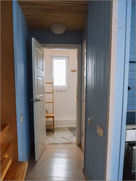 В доме есть небольшая кухня, холодильник, столовая посуда и посуда для готовки, СВЧ, 2 кровати шириной 160 см. душ, туалет, стол. WIFI