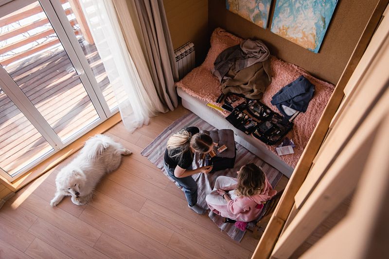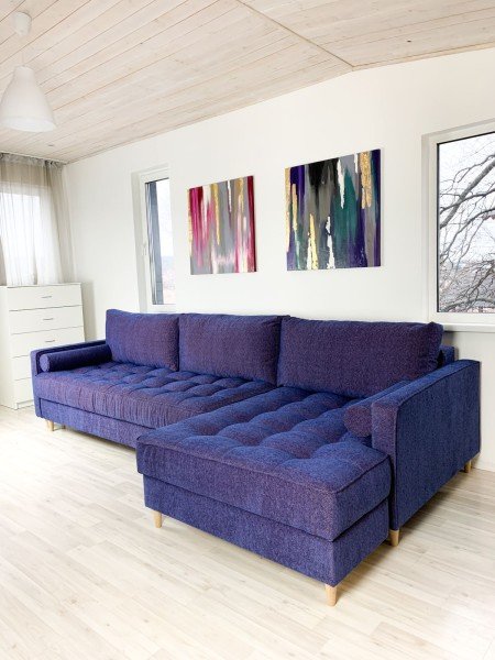 2 этажа — 2 спальни и 2 гостиных, гостиная на первом этаже с обеденной зоной, диваном, который раскладывается на двоих. Гостиная на втором этаже с тв и раскладным диваном на двоих.