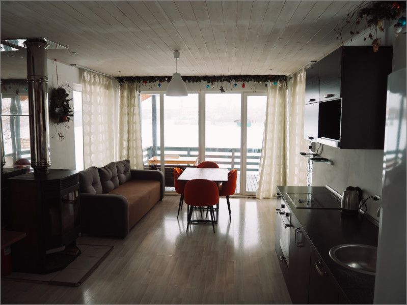 В доме есть небольшая кухня, холодильник, столовая посуда и посуда для готовки, тв, 2 кровати шириной 160 см. (одна из них находится на втором ярусе), душ, туалет, раскладной стол на 4-х. Вам предоставят постельное белье и полотенце, а также питьевую воду. Дом очень уютный, к дому пристроена веранда с красивым видом на реку.