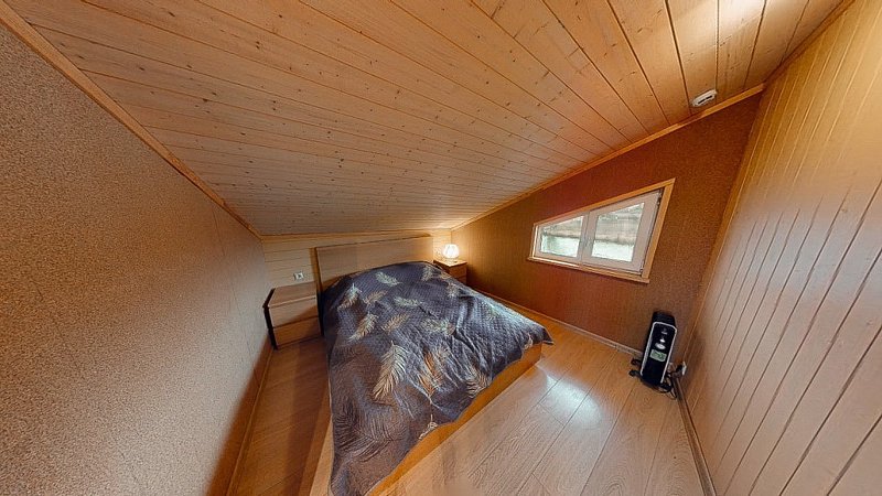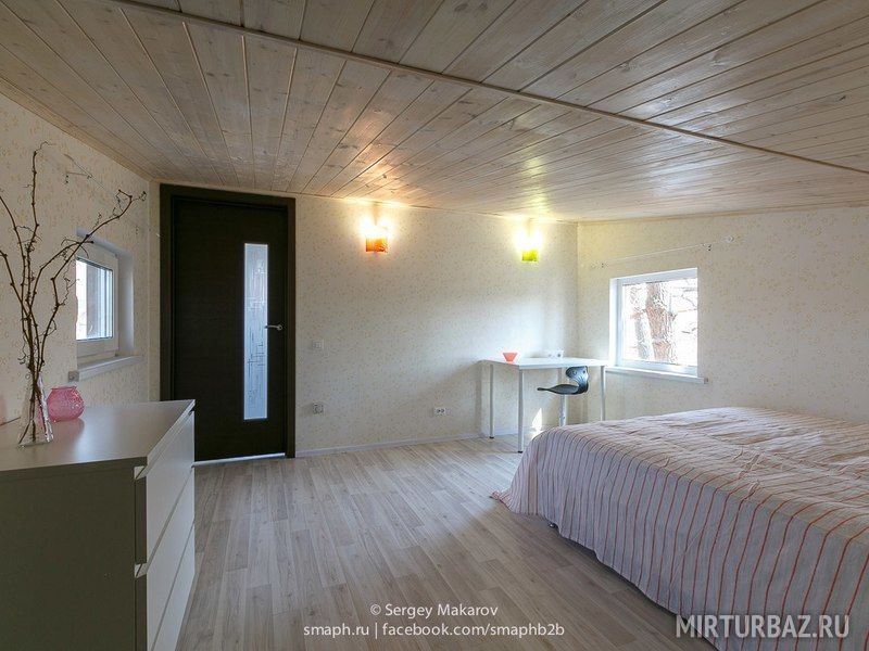 На первом этаже располагается гостиная и спальня с 2-х спальной кроватью. На втором этаже спальня с 2-х спальной кроватью и гостиная с диваном, который раскладывается на двоих.