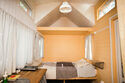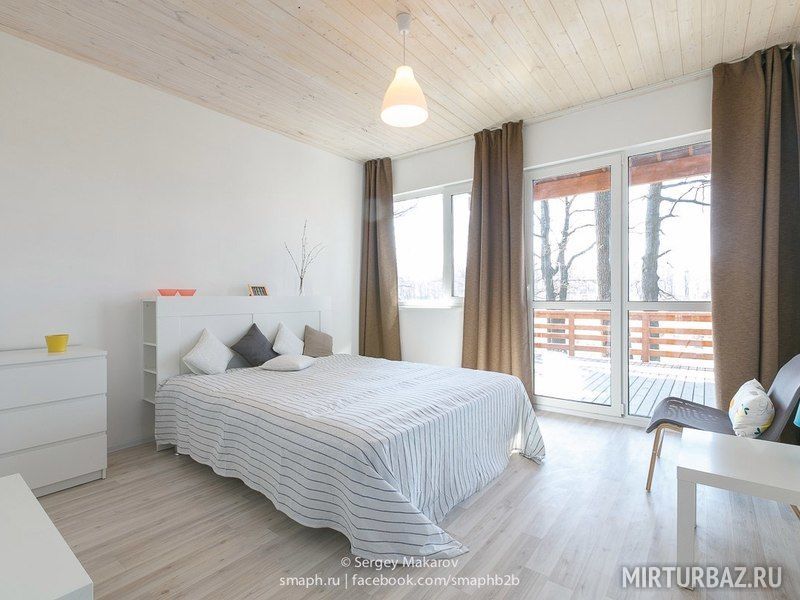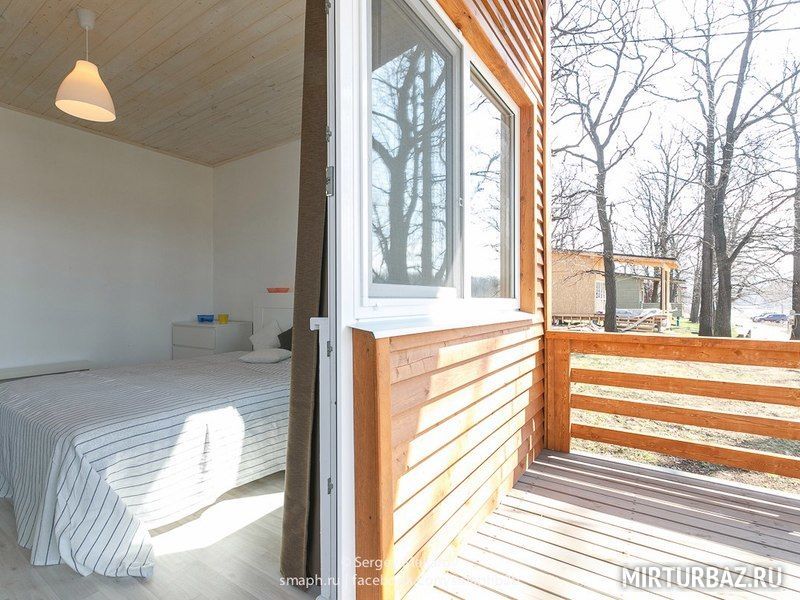 На первом этаже расположилась гостиная с верандой и спальня с 2-х спальной кроватью с верандой.