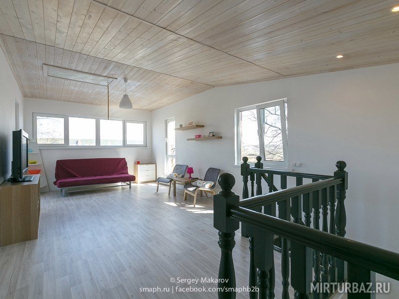 На втором этаже три отдельных комнаты — две спальни — одна комната с двуспальной кроватью, одна комната с диваном, который раскладывается на двоих и одна комната с двумя креслами кроватями.