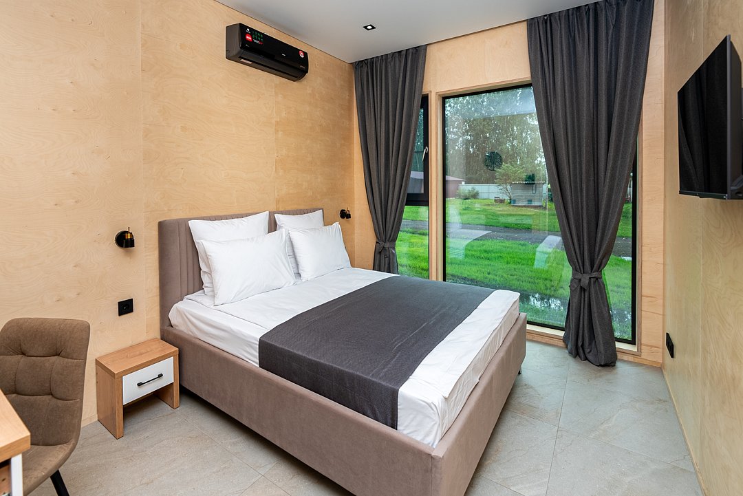 Двуспальная кровать, диван, телевизор, холодильник, кондиционер, кухонная зона, с/у душ