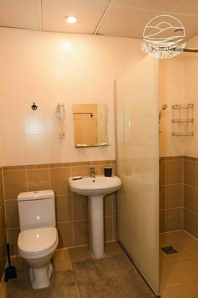 Одна 2-х спальная кровать, мягкая мебель, холодильник, чайник, кондиционер, ж/к телевизор 32", душевая кабина, платяной шкаф,wi-fi. Ежедневно гель для душа, шампунь, чай+сахар (1 раз в день) площадь номера 30 м2 (в т.ч. с/у)