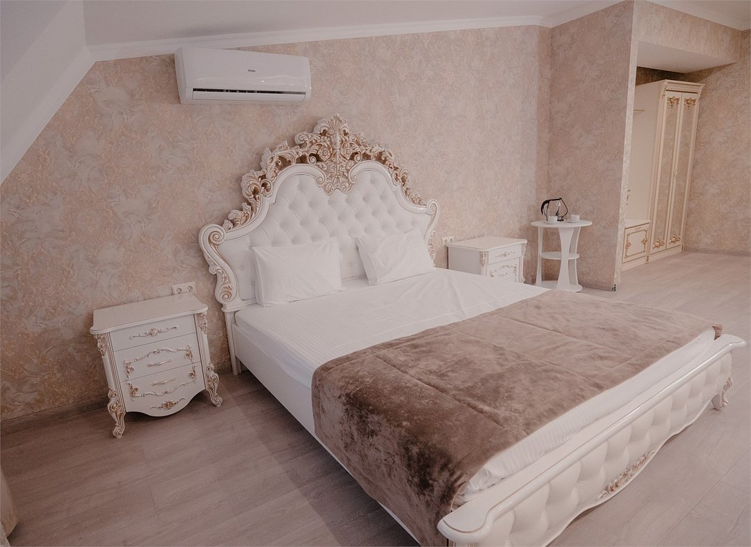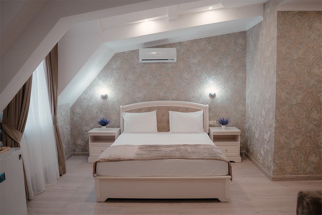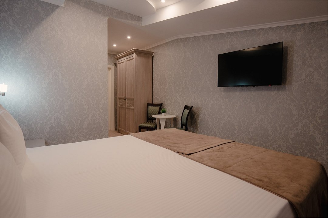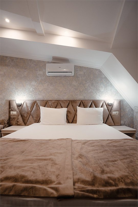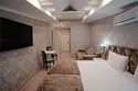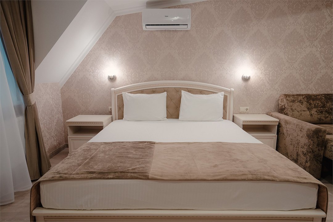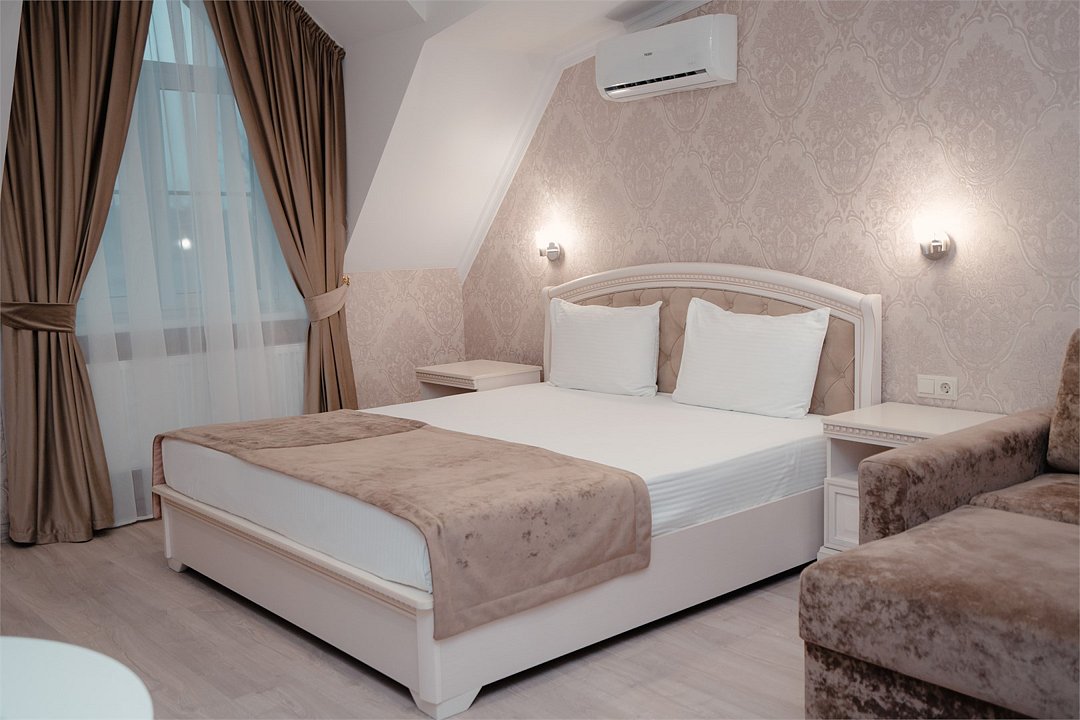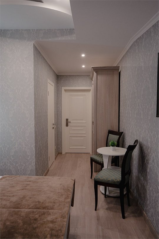 "Бизнес" однокомнатный номер повышенной комфортности. В Вашем распоряжении просторная, уютная спальня с большой удобной кроватью. Интерьер выполнен в выдержанном классическом стиле с нежными приглушенными тонами в оформлении всех зон.Услуги и удобства