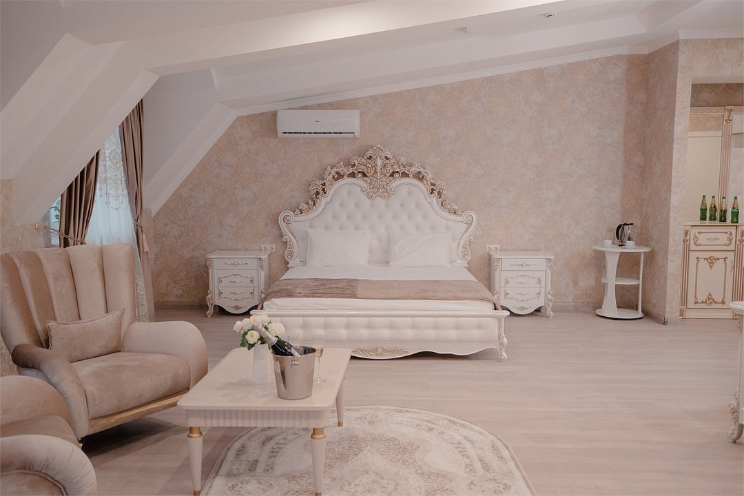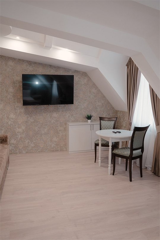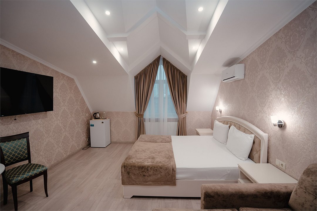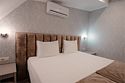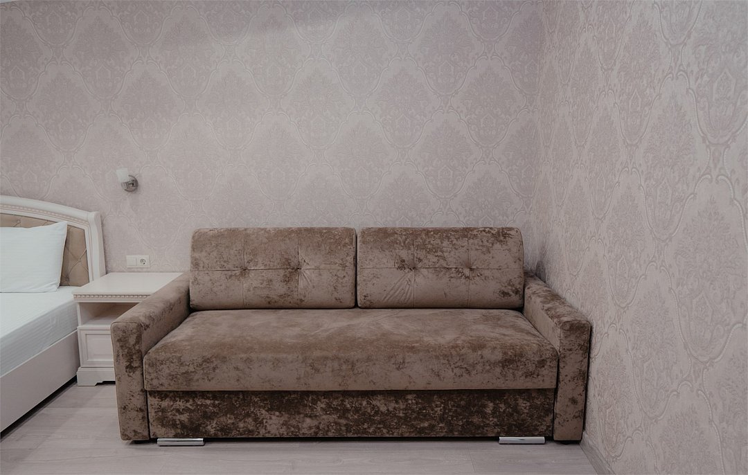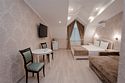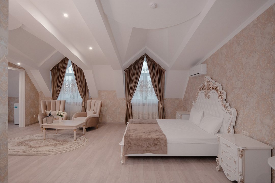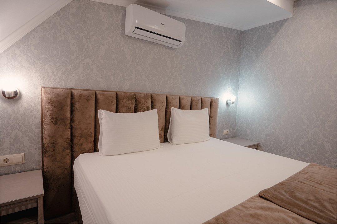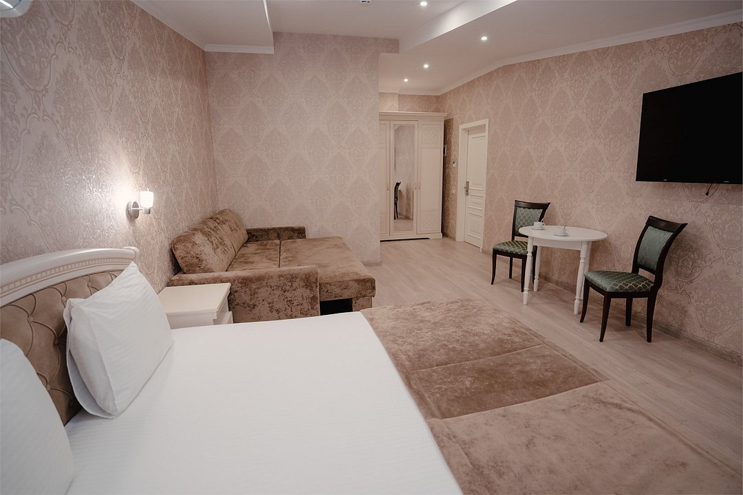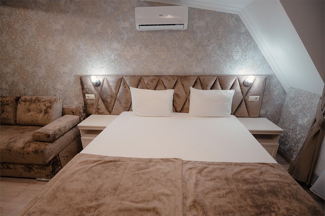 "Бизнес" однокомнатный номер повышенной комфортности. В Вашем распоряжении просторная, уютная спальня с большой удобной кроватью. Интерьер выполнен в выдержанном классическом стиле с нежными приглушенными тонами в оформлении всех зон.Услуги и удобства